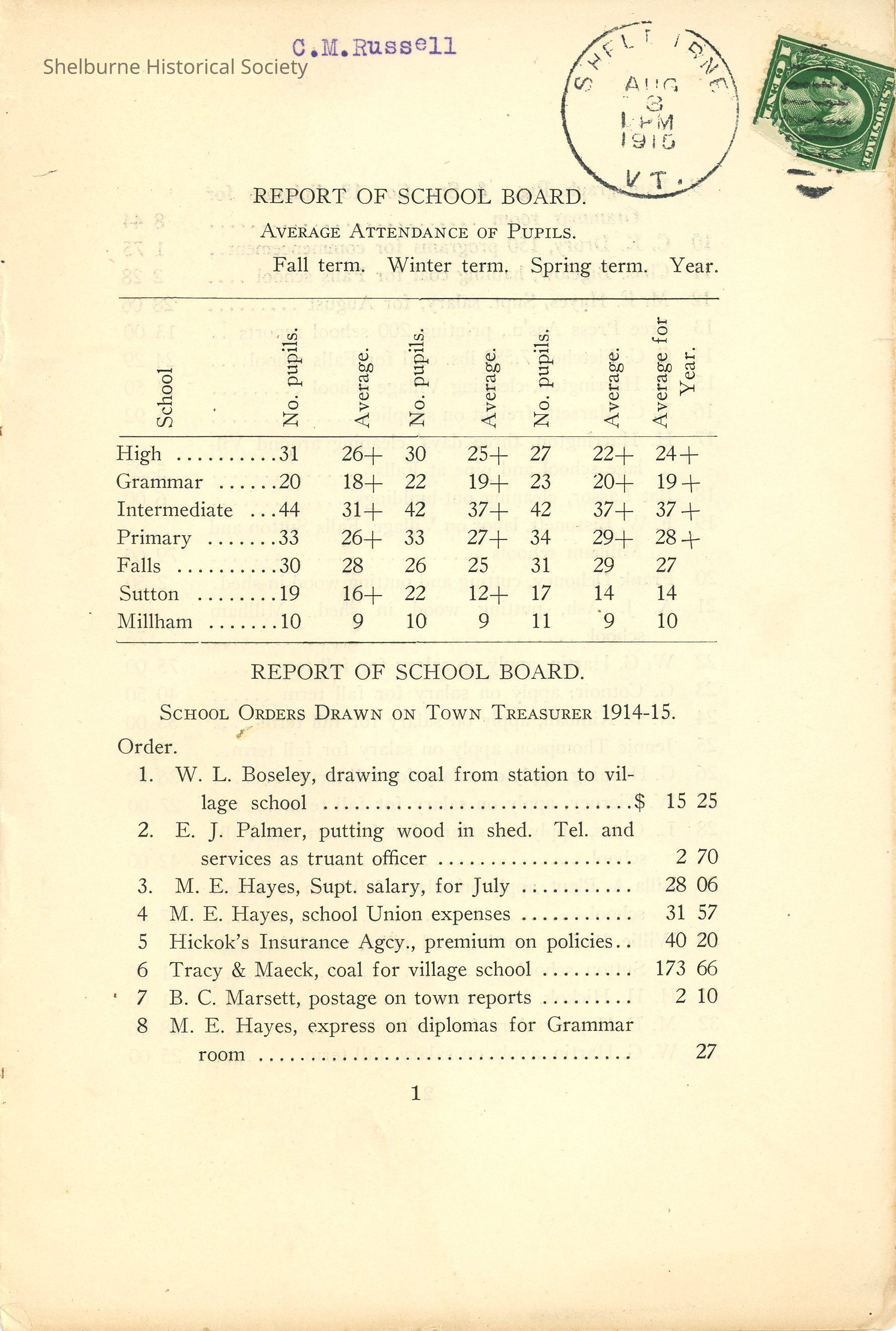 This Report of School Board postmarked 1915 contains abundant information about the schools, expenditures, personnel, activities, and in the Superintendent's Report, written by Minnie E. Hays, period information about the changes occurring in the shools.Context