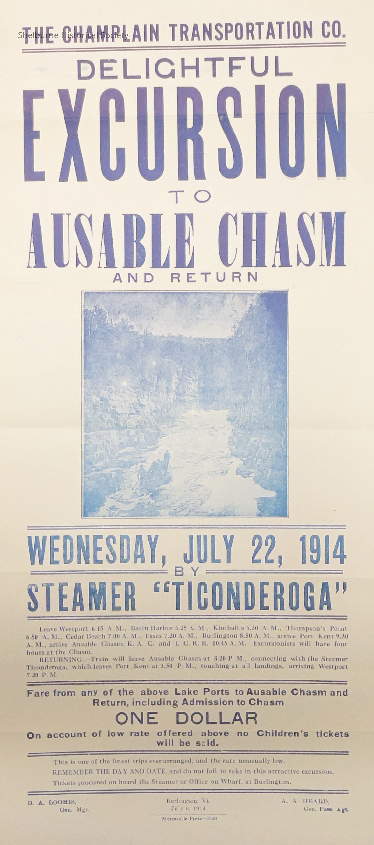 This poster advertises a Champlain Transportation Co. excursion on the streamer Ticonderoga on July 18, 1914 leaving from Burlington, Vermont and traveling to Cedar Beach in Charlotte, Vermont and to Westport, New York all on the same evening.Lexicon