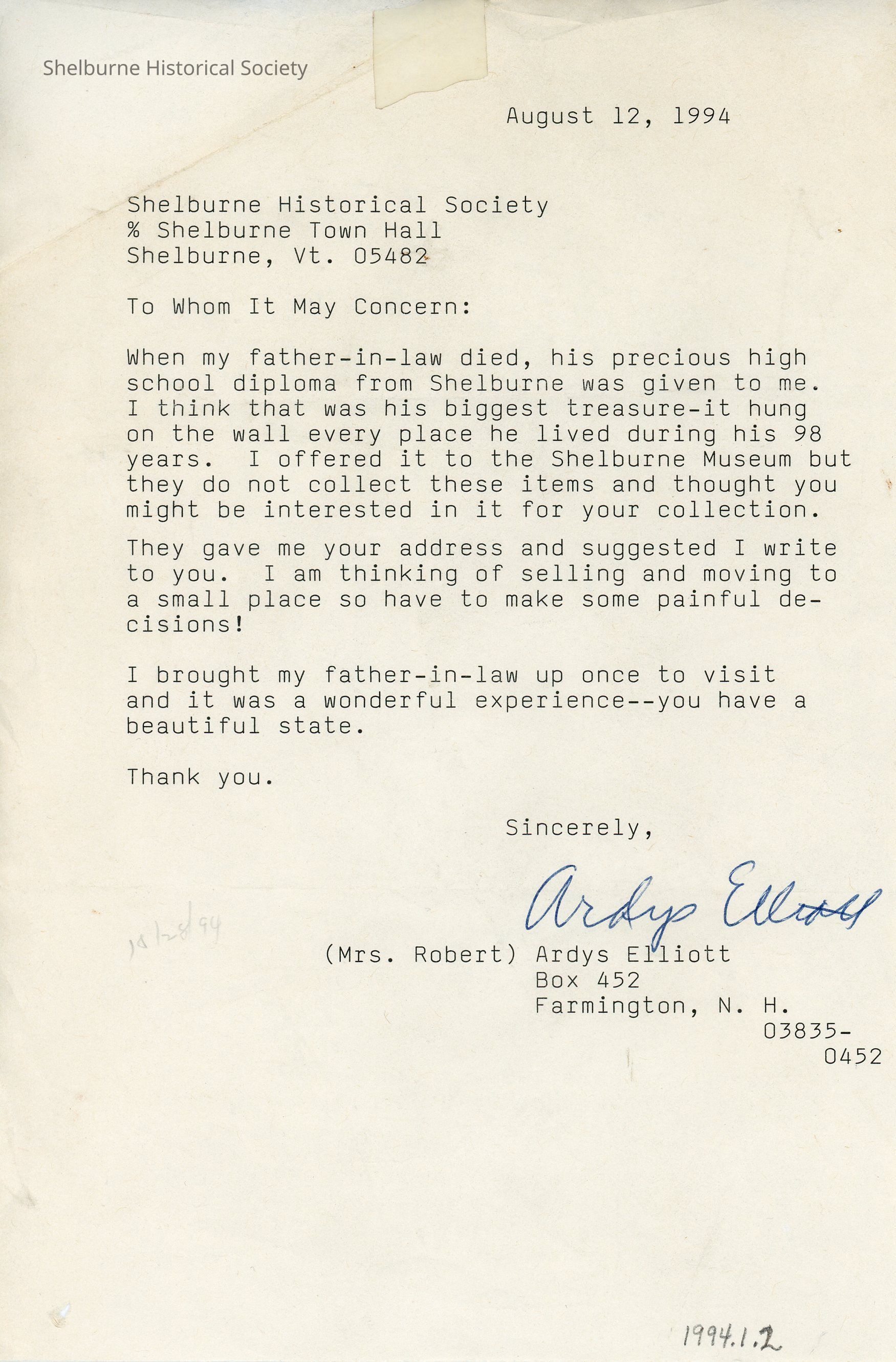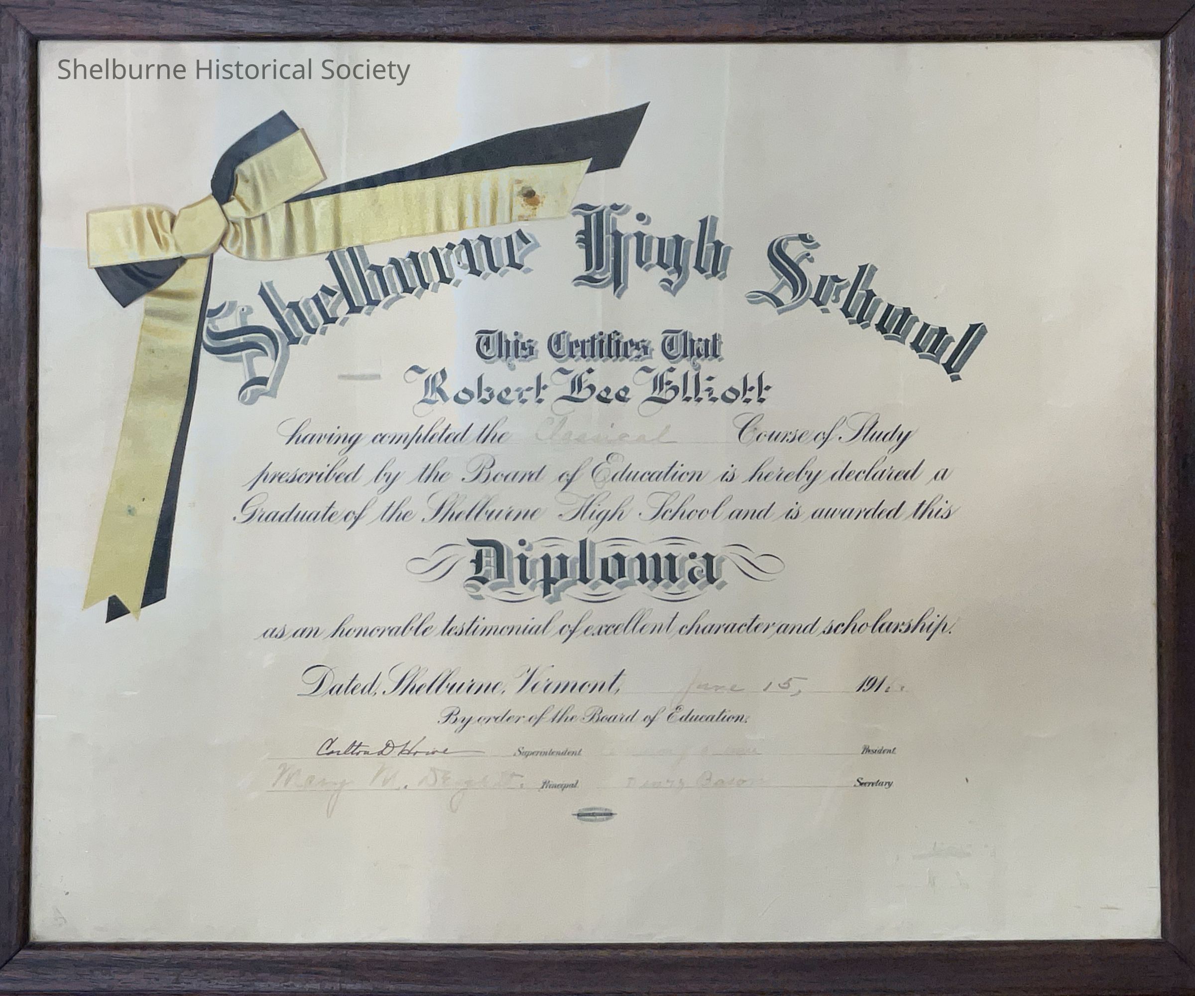 Diploma, Shelburne High School, Robert Lee Elliott, June 15, 1911