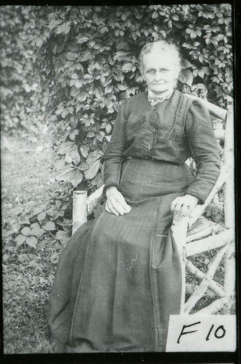 Mrs. Marion Kenyon Thompson (1844-1930), was the wife of Timothy Thompson of Shelburne Bay., The portrait, taken when she was in her 60's, seated on a rustic chair, was taken at Queen City Park.Photograph Details