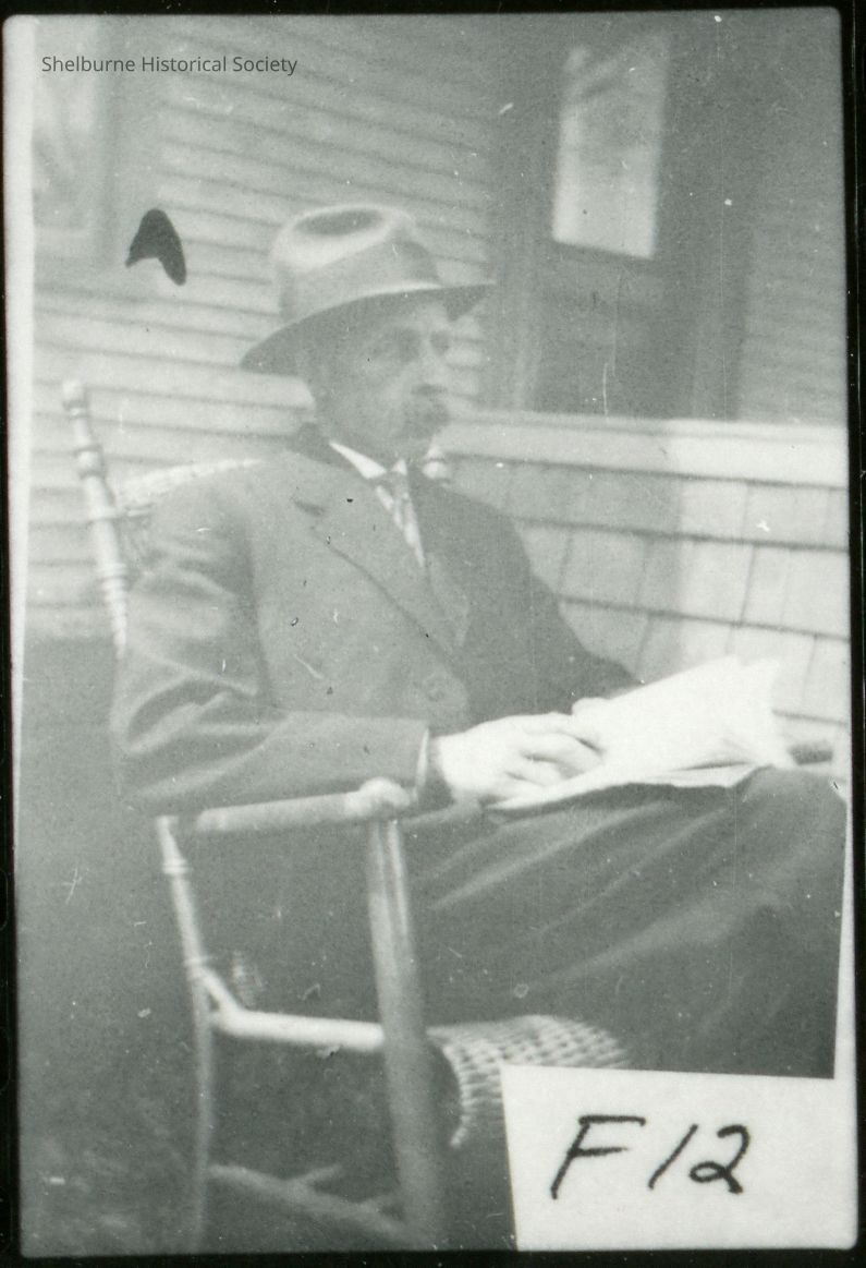 Noble Kenyon, brother of Marion Kenyon Thompson, who lived a the head of Shelburne Bay, sits outdoors, in a rustic armchair, newspaper open on his lap.Photograph Details
