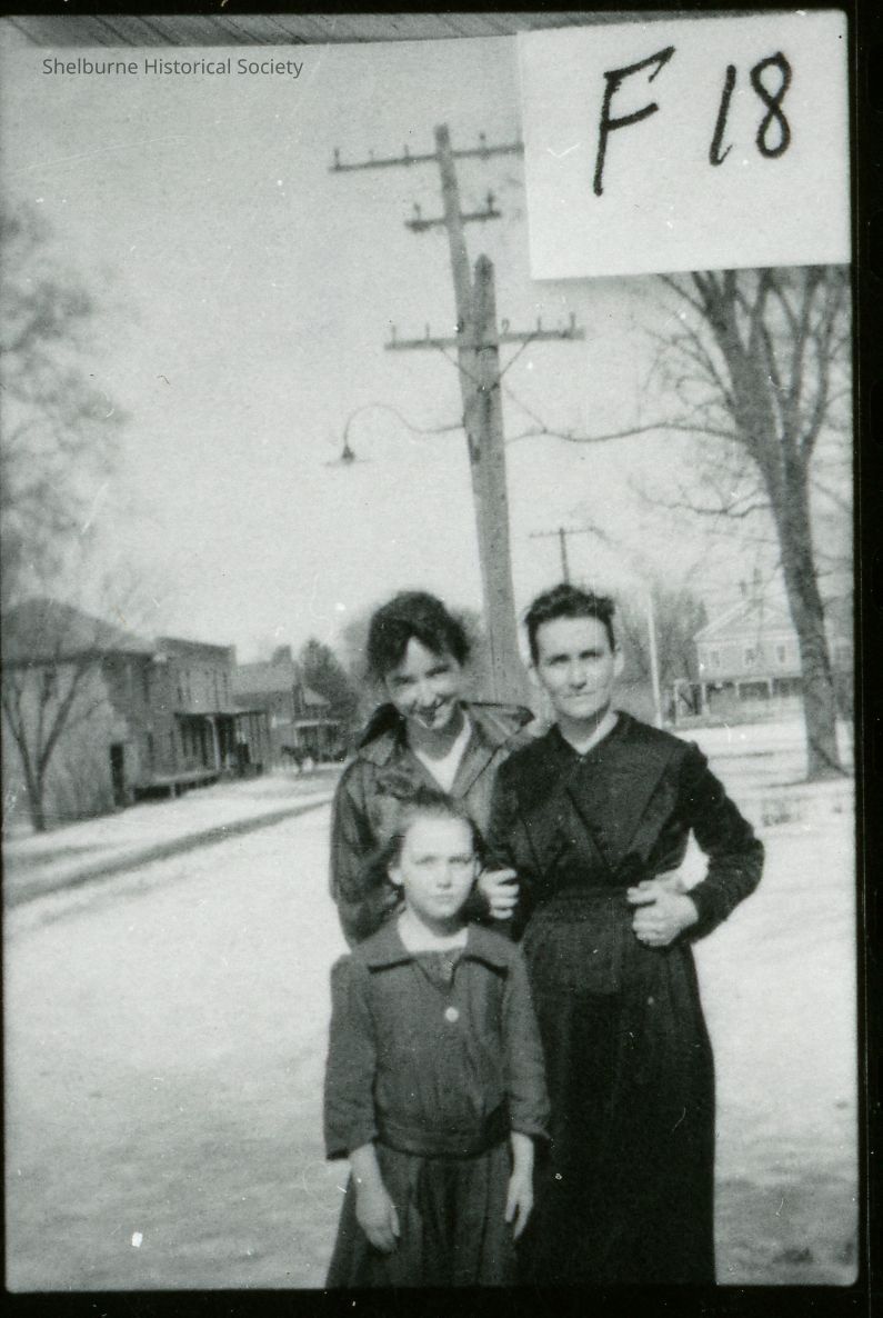 Ranks family, mother and daughter, with friend. Taken in front of Mrs. Ranks house. Helen Ranks Gadhue (child in front), mother Fannie W Ranks (behind on right), Alice Stewart DuBuc, a teacher in the village school (on left).Photograph Details