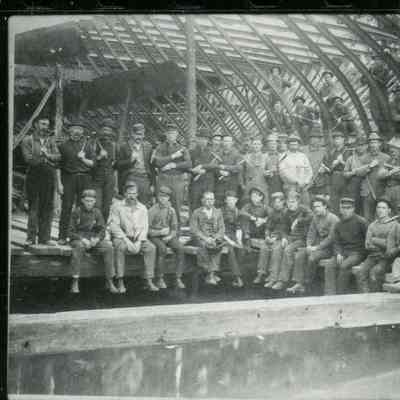 Champlain Transportation Company Employees, posed in front of steamer hull. Ca. 1890-1902.