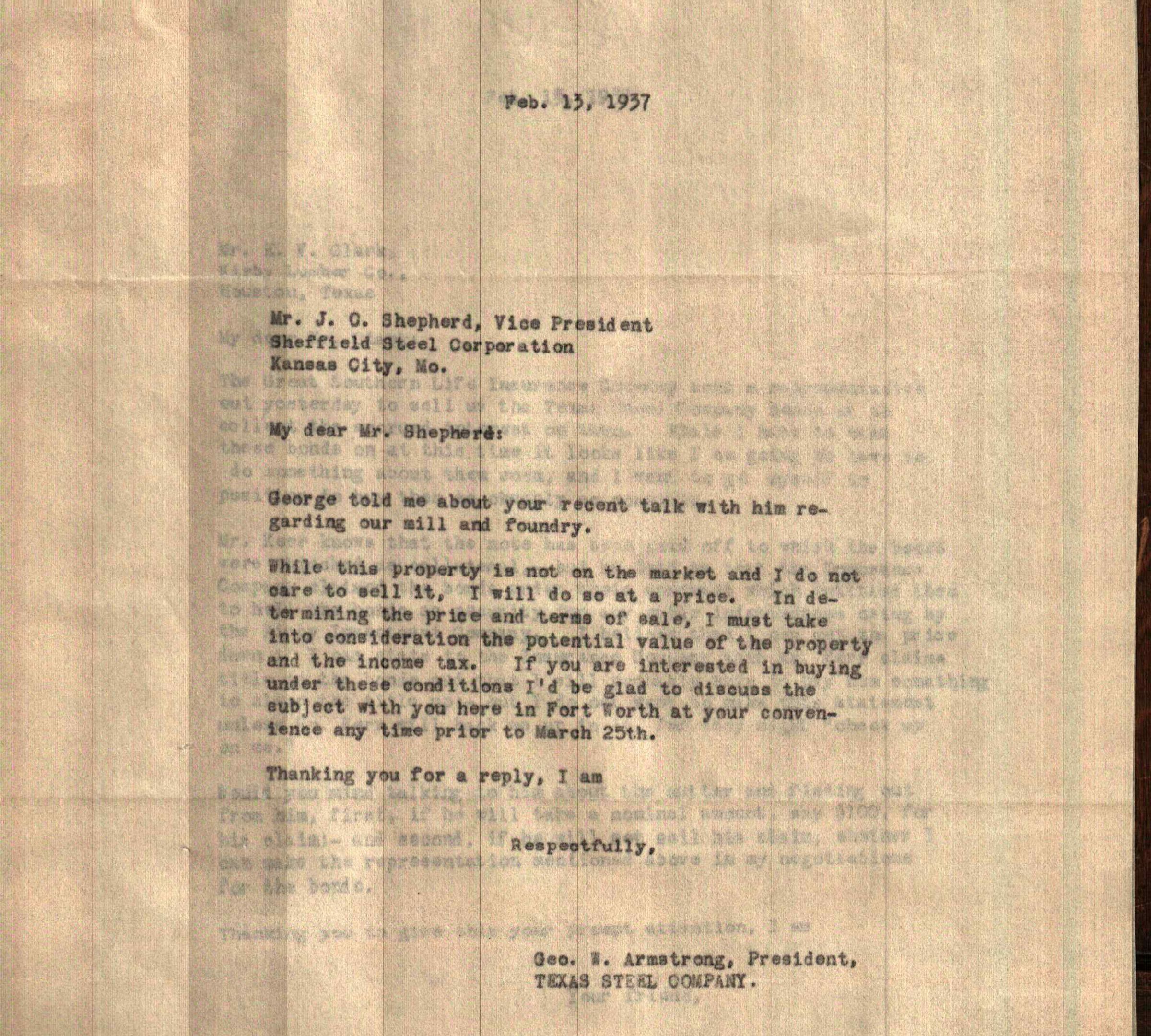 Letter to C Shepherd from George W Armstrong dated February 13, 1937 concerning property saleTags