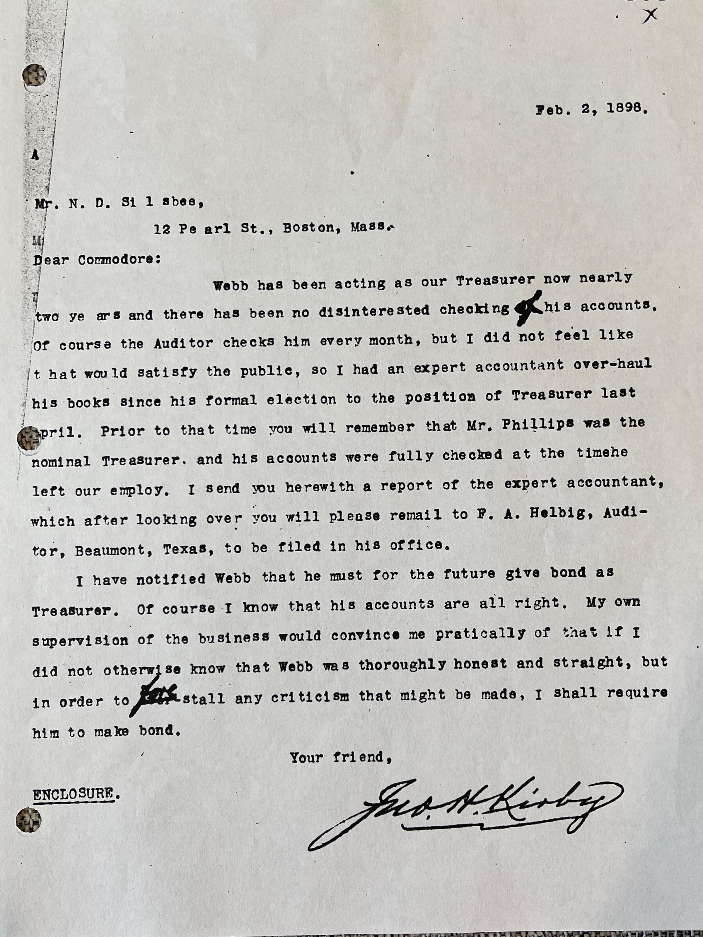 Letter to Nathaniel Silsbee from John H Kirby February 2, 1898 concerning auditTags