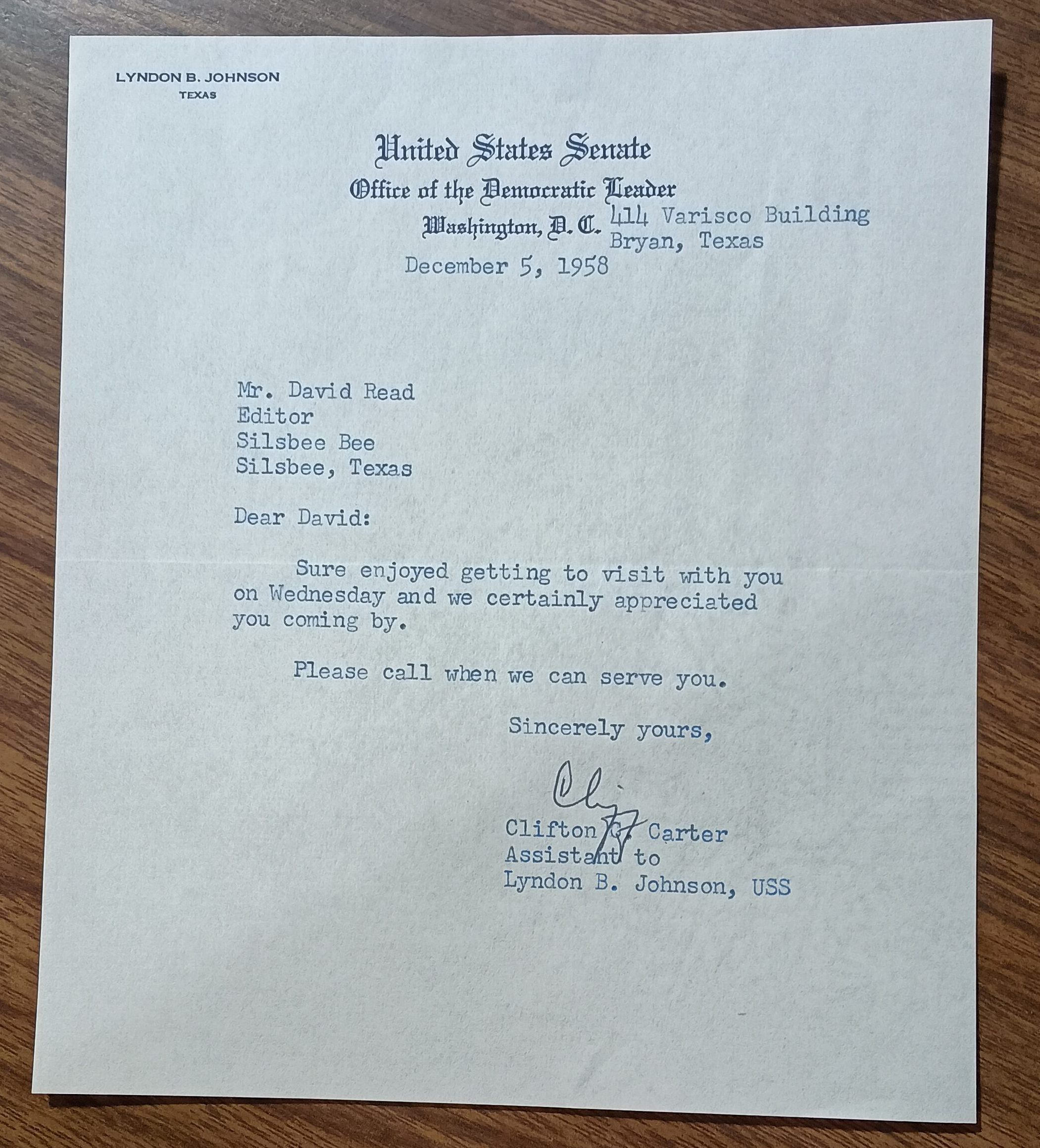 Letter to David Read, Editor, Silsbee Bee, from Clifton C Carter, Assistant to Lyndon B Johnson dated December 5, 1958 expressing joy in gett to visitCollection