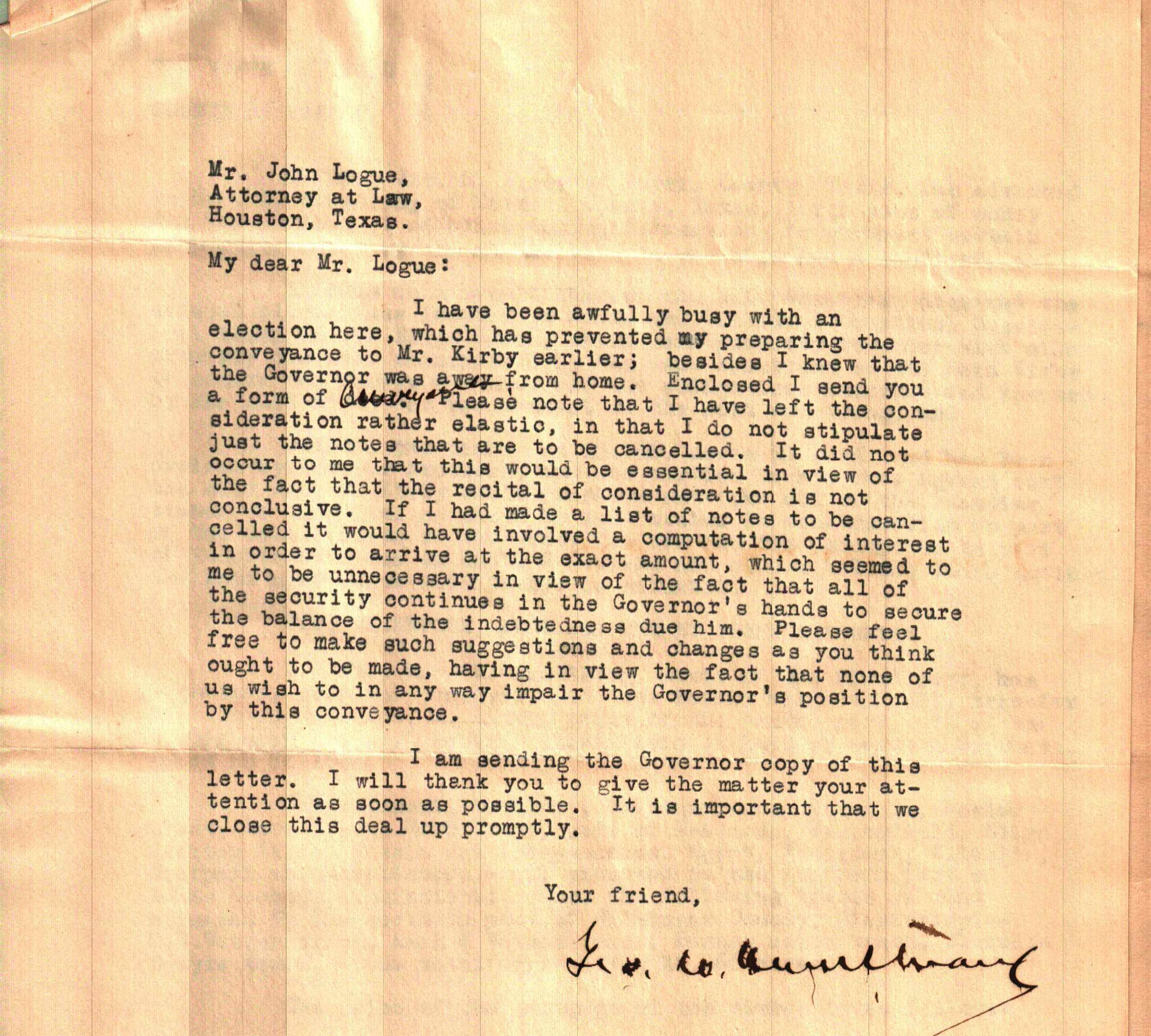 Letter from George W Armstrong to John Logue, Attorney at Law, concerning conveyance to John Henry KirbyTags