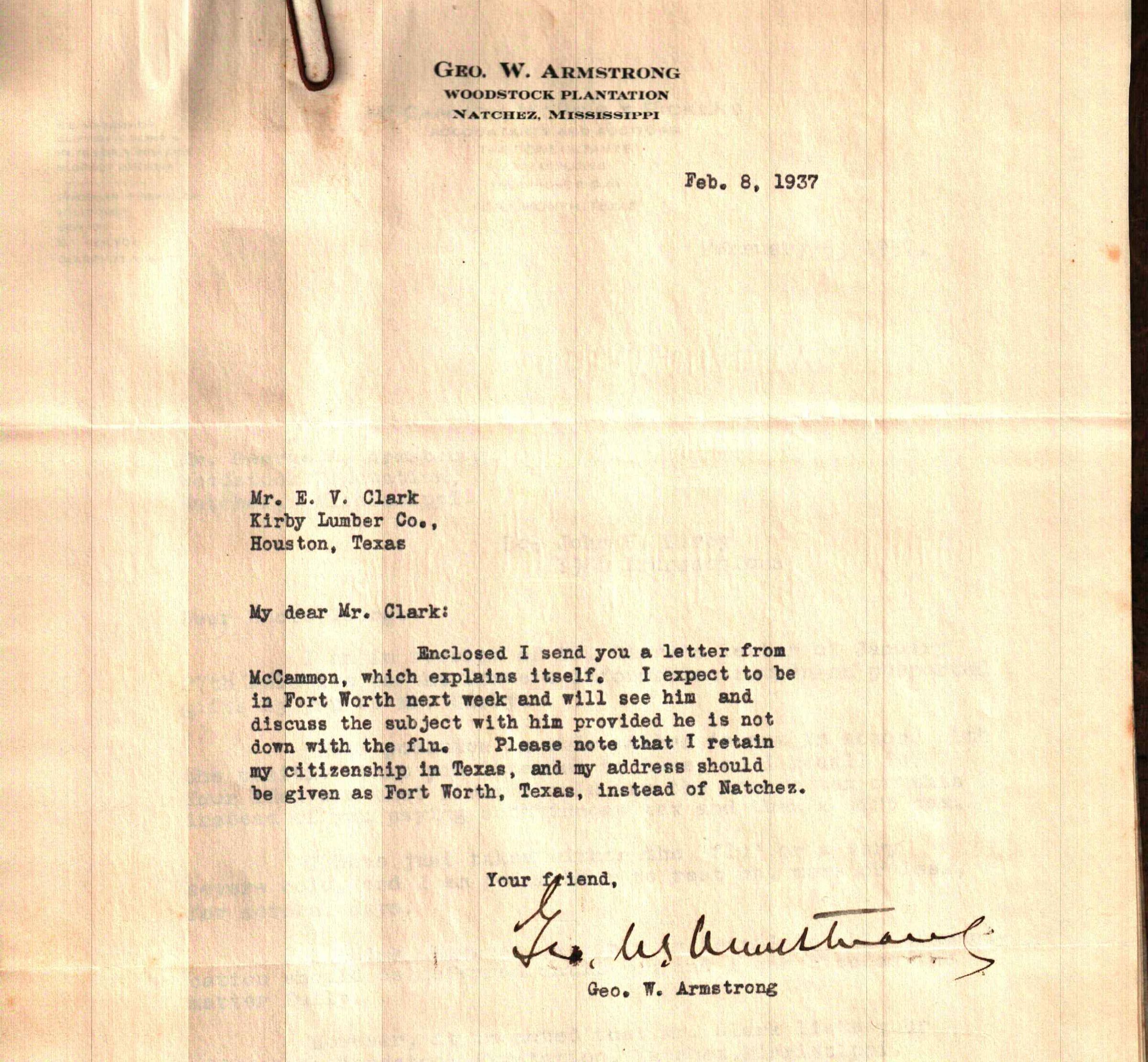 Letter to E V Clark from George W Armstrong February 8,1937Tags