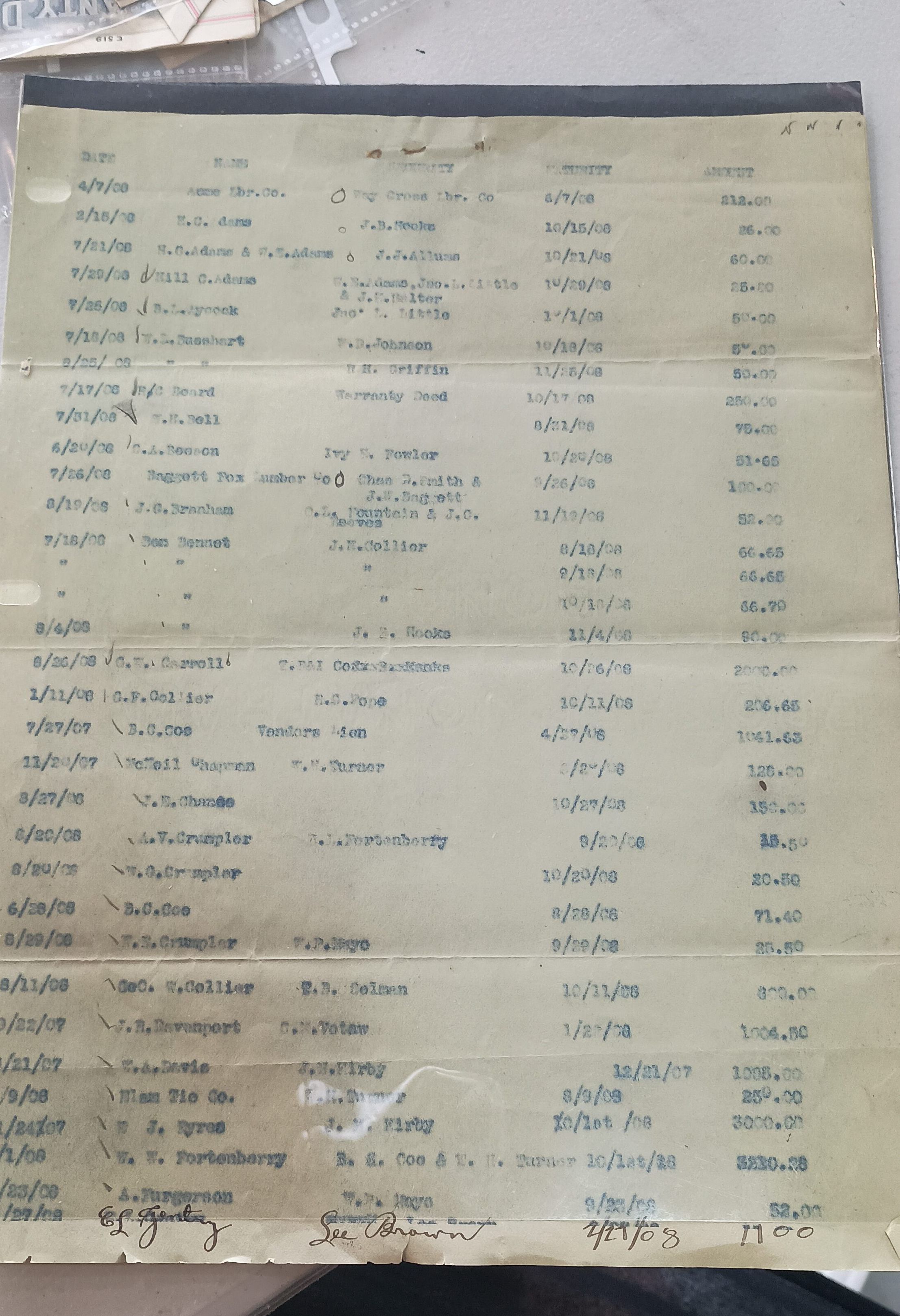 Typed ledger pages, not bound dated 1908, J. H. Kirby is listed on first page
