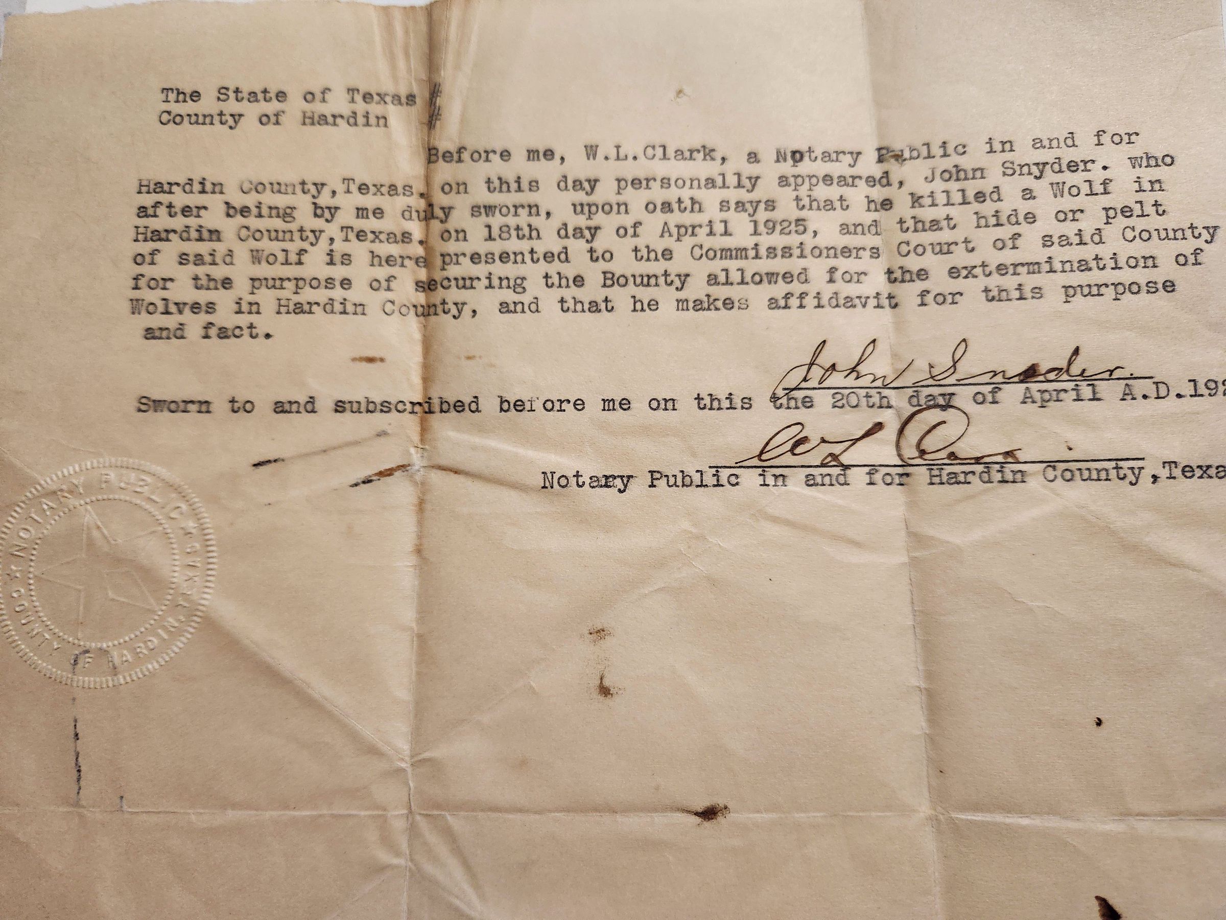 Affidavit of Wolf Kill by John Snyder