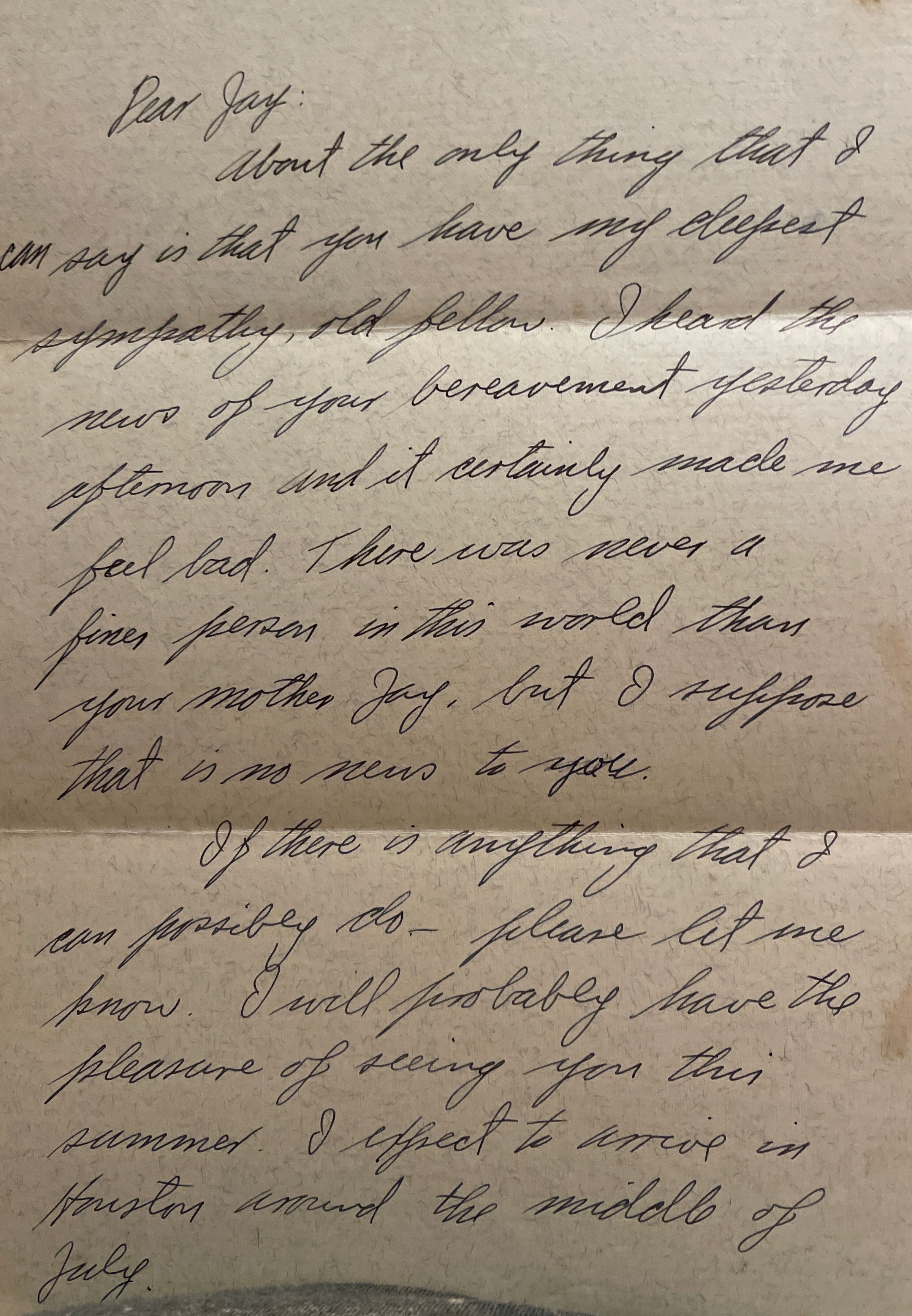 John H. Blaffer is expressing his sympathy to JHK II upon the death of his mother.Collection