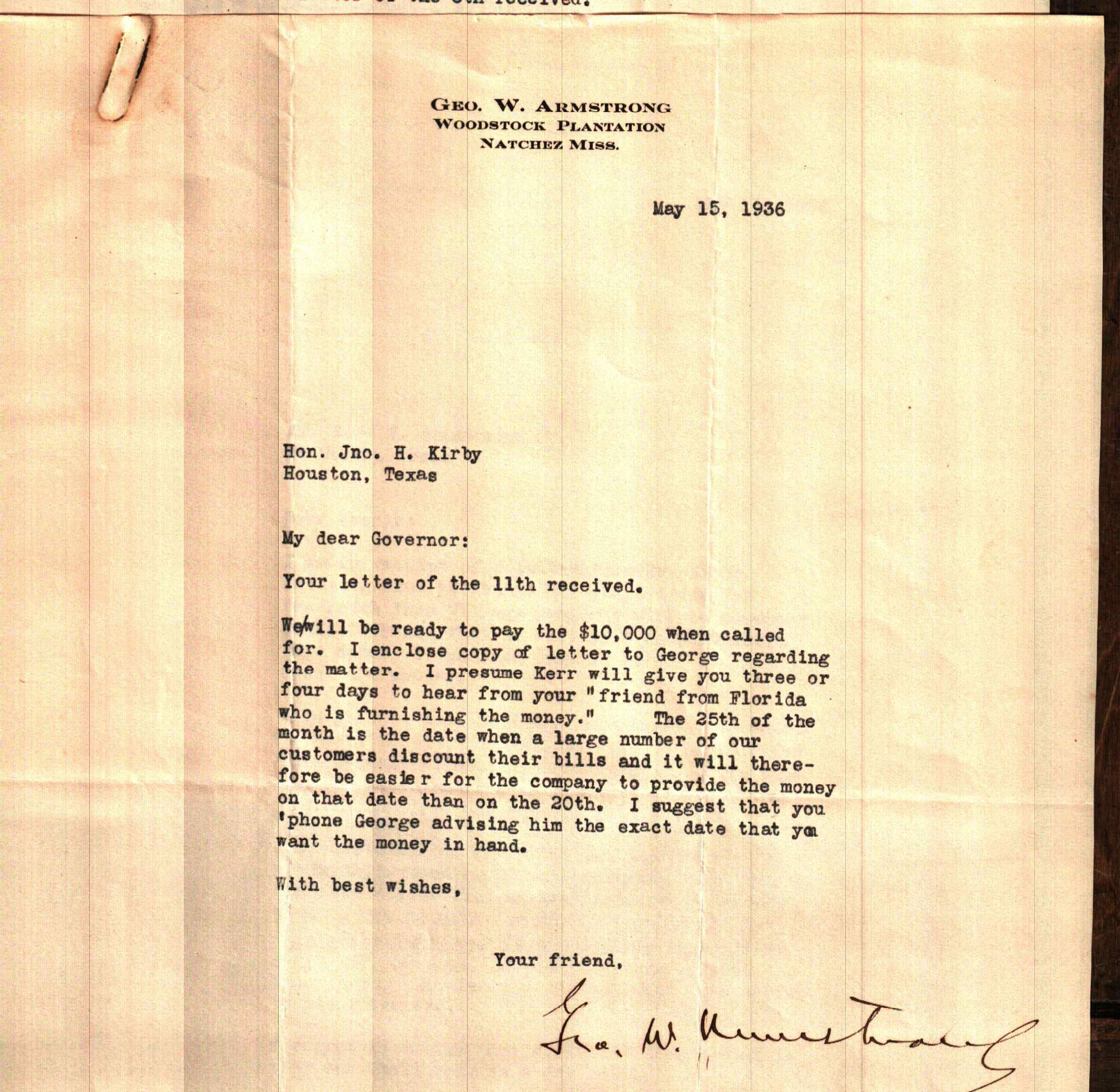 Letter from George W Armstrong to John H Kirby dated May 15, 1936 concerning $10,000 note paymentTags