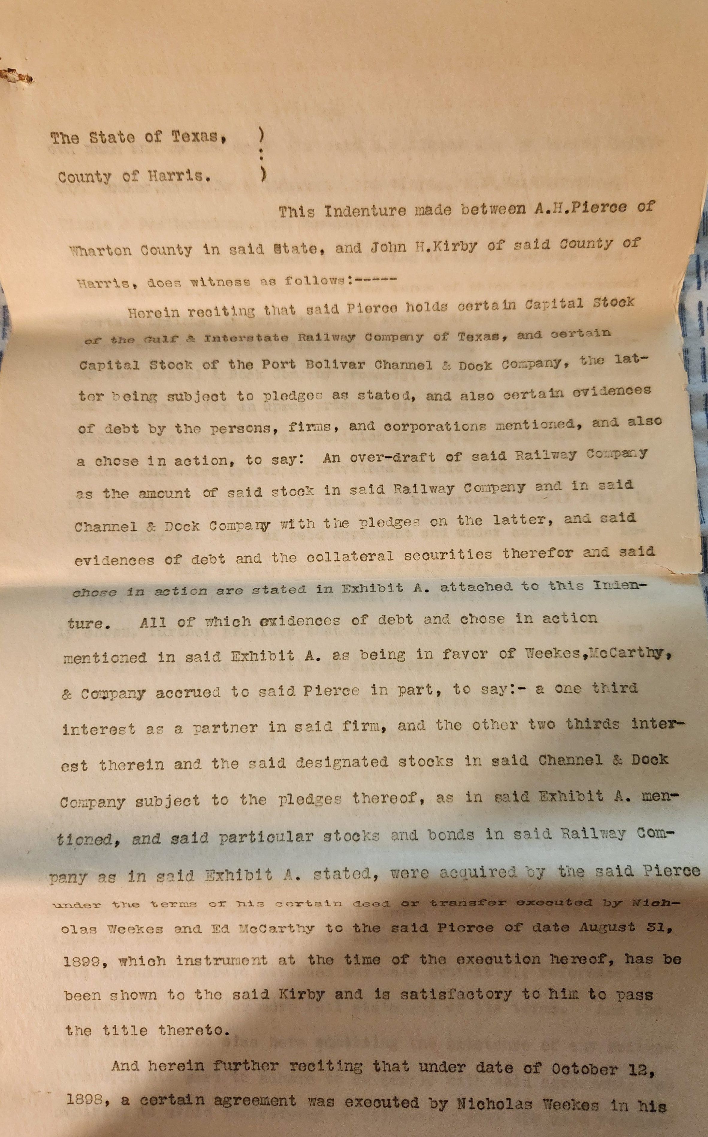 Court Document of Harris Co, Texas - Indenture between A H Pierce and John H Kirby Gulf & Interstate Railway and Port Bolivar Channel & Dock CompanyTags