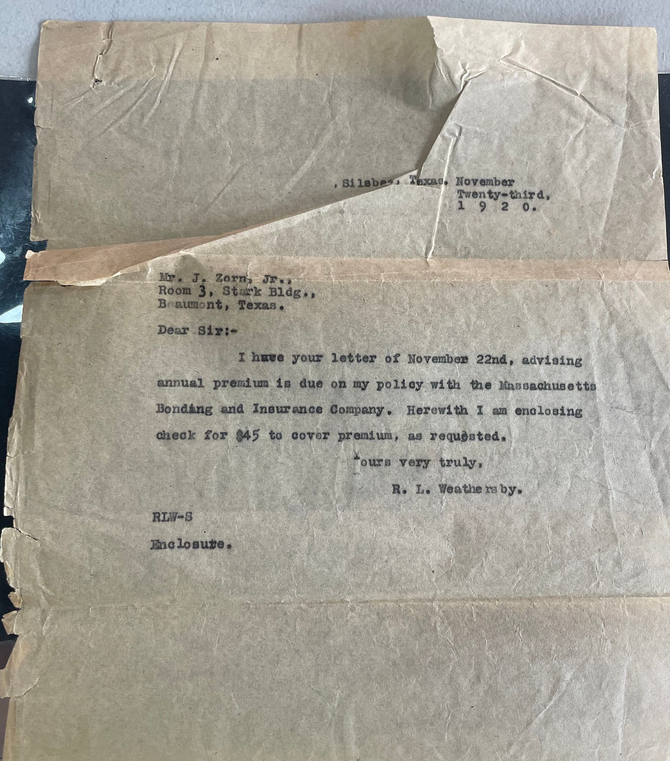 Letter to J Zorn Jr from R L Weathersby concerning Premiums dueTags