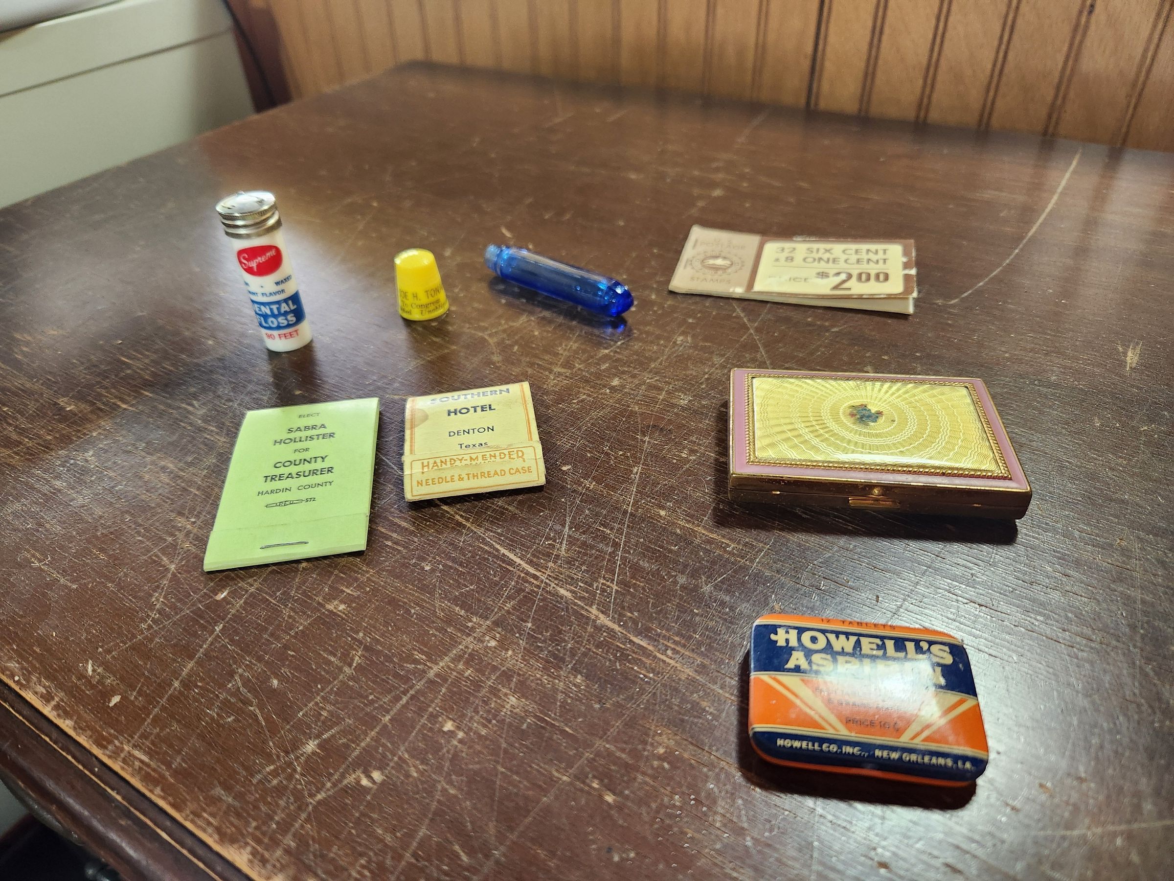 Dental Floss, Thread Repair Kit, Thimble, Bottles, Aspirin Case, Womens Powder CaseScope and Content