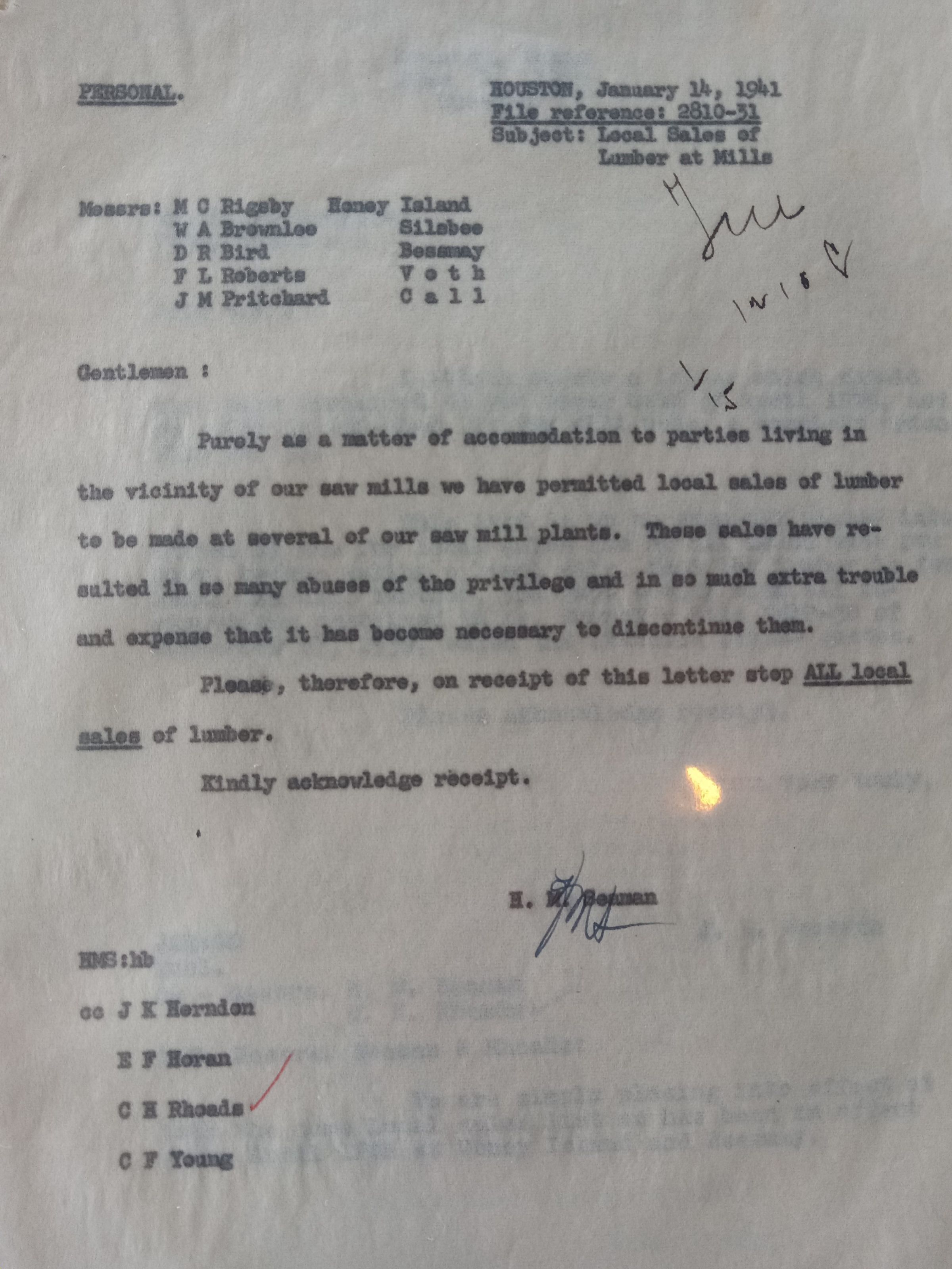 Letter to Mill Managers from H M Seaman dated Janaruy 14, 1941 stopping all " Local Sales" of timber from MillsTags