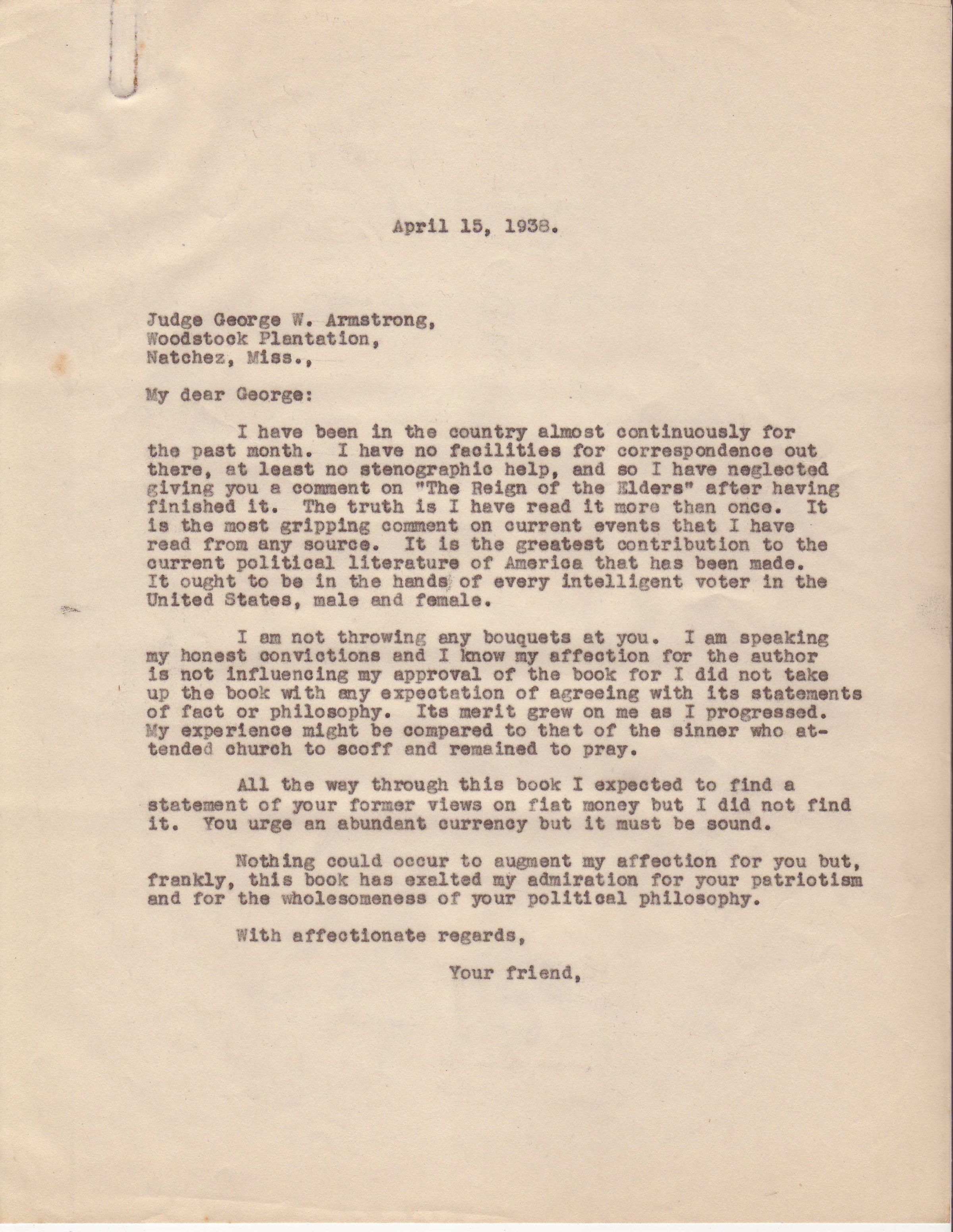 Mr. Kirby is responding to a letter sent to him from Armstrong. Judge Armstrong wrote a book that, and wanted Kirby's review.Collection