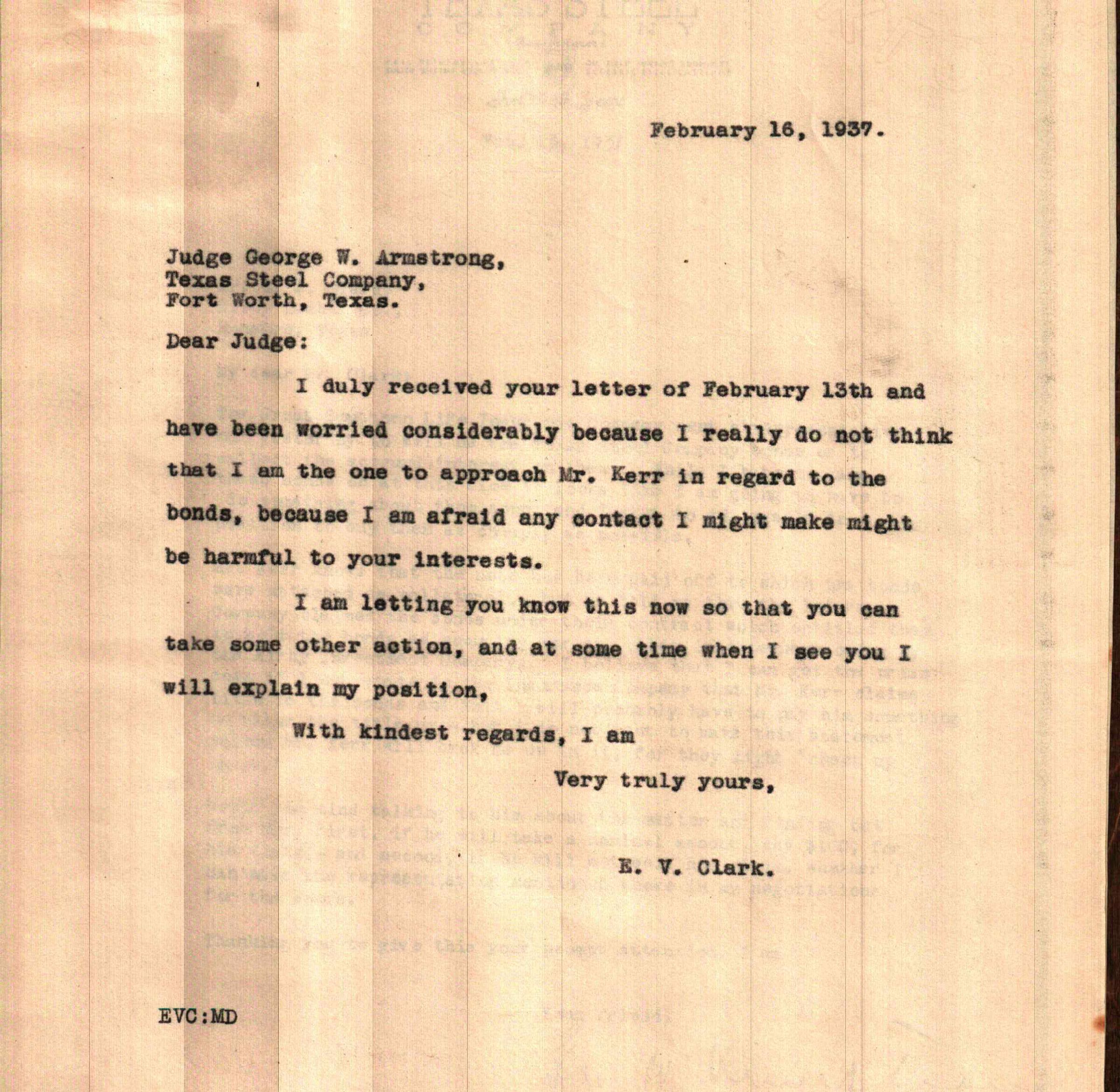 Letter from E V Clark to George W Armstrong February 16,1937Tags