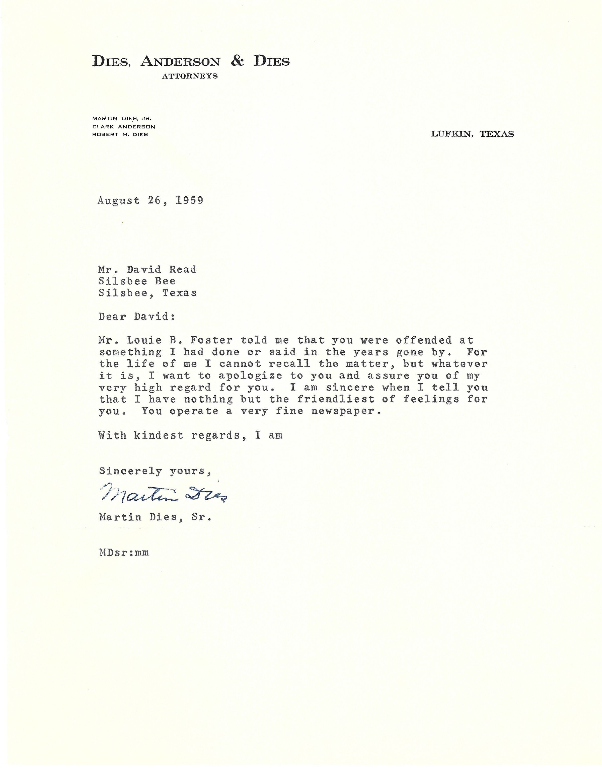 Letter to David Read from Martin Dies Sr August 26, 1959Tags