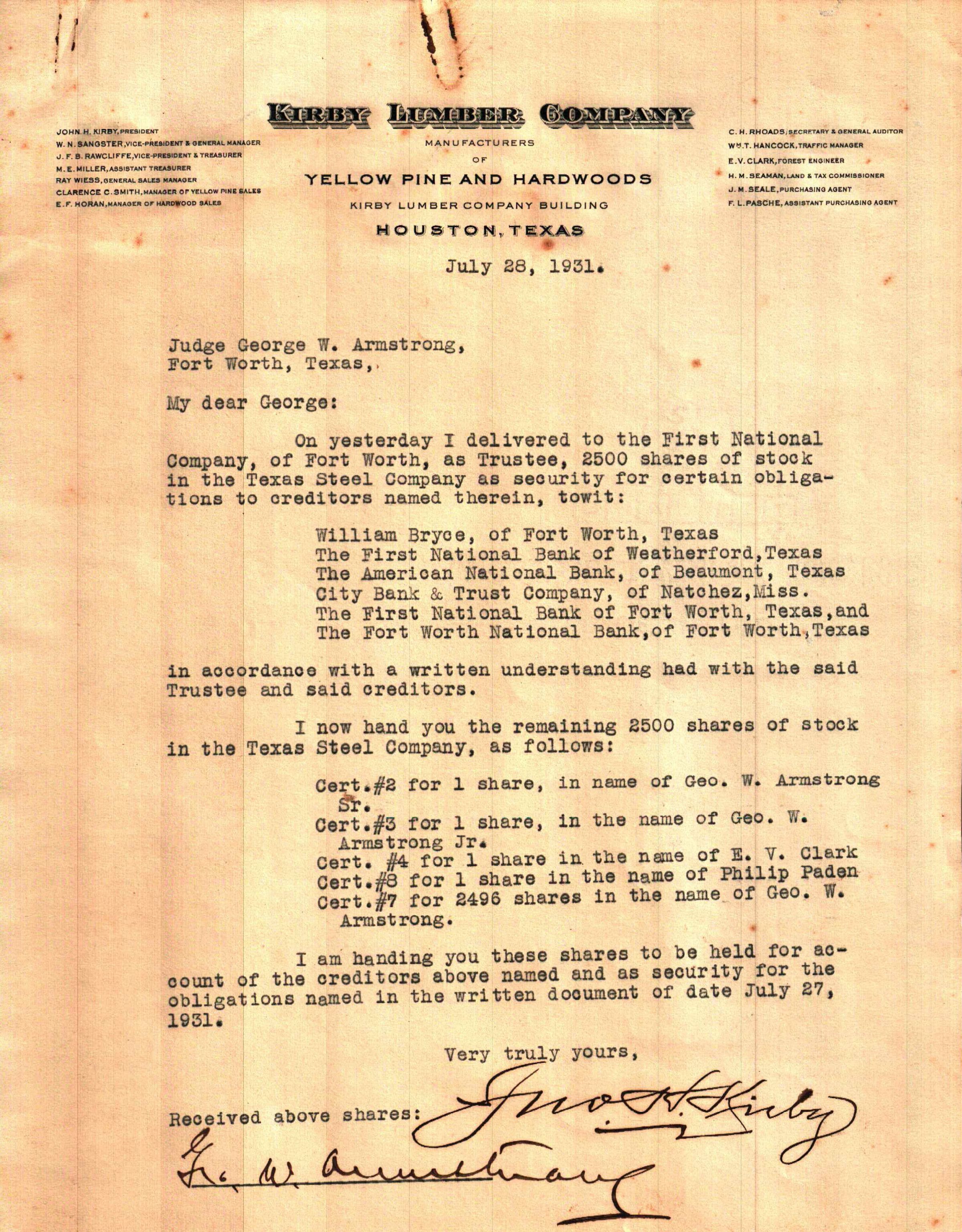Letter from John Henry Kirby to George W. Armstrong dated July 28, 1931 concerning stock distributionTags