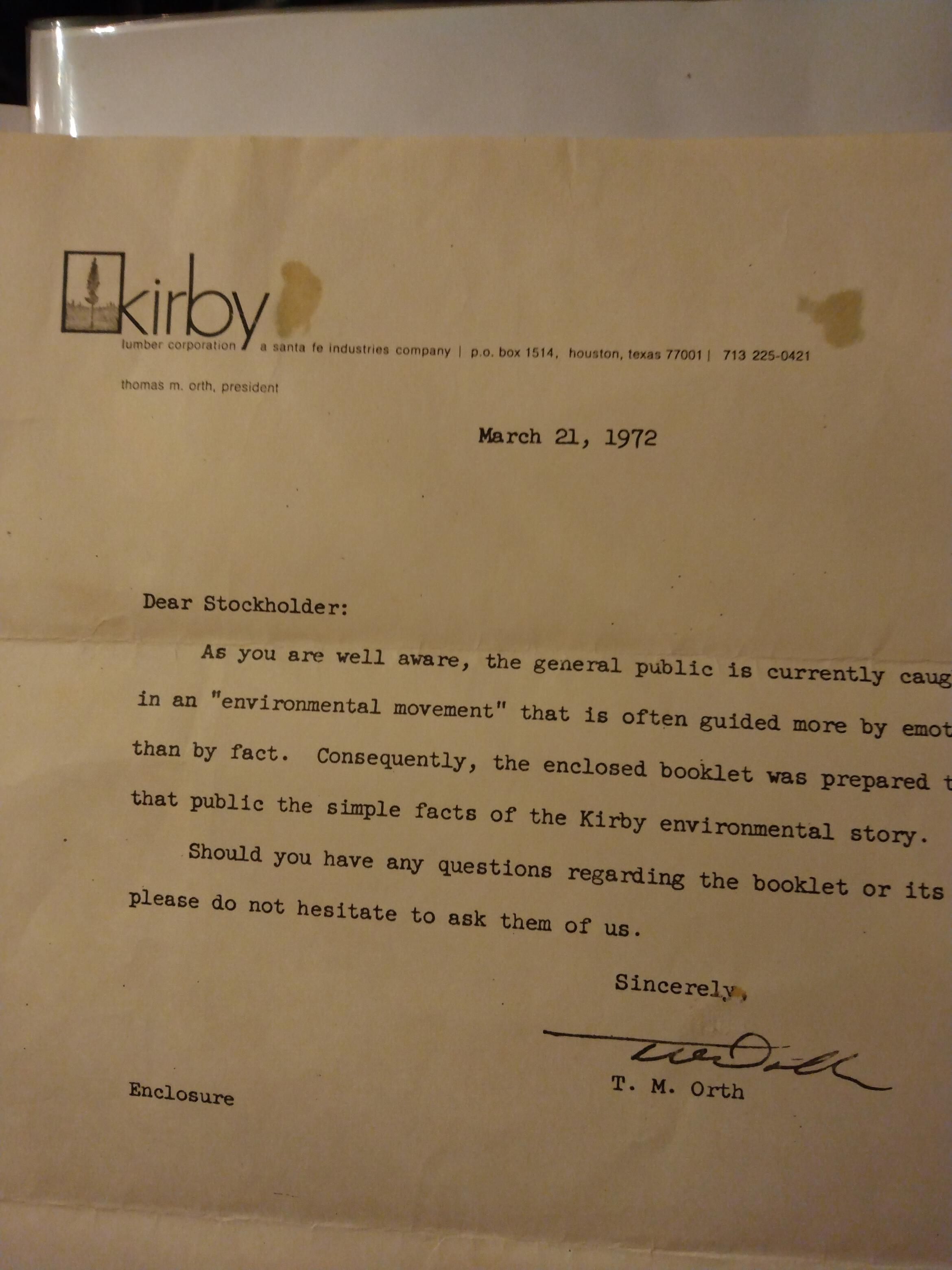 Letter from T M Orth to Stockholders of Kirby Lumber Co March 21, 1972Tags