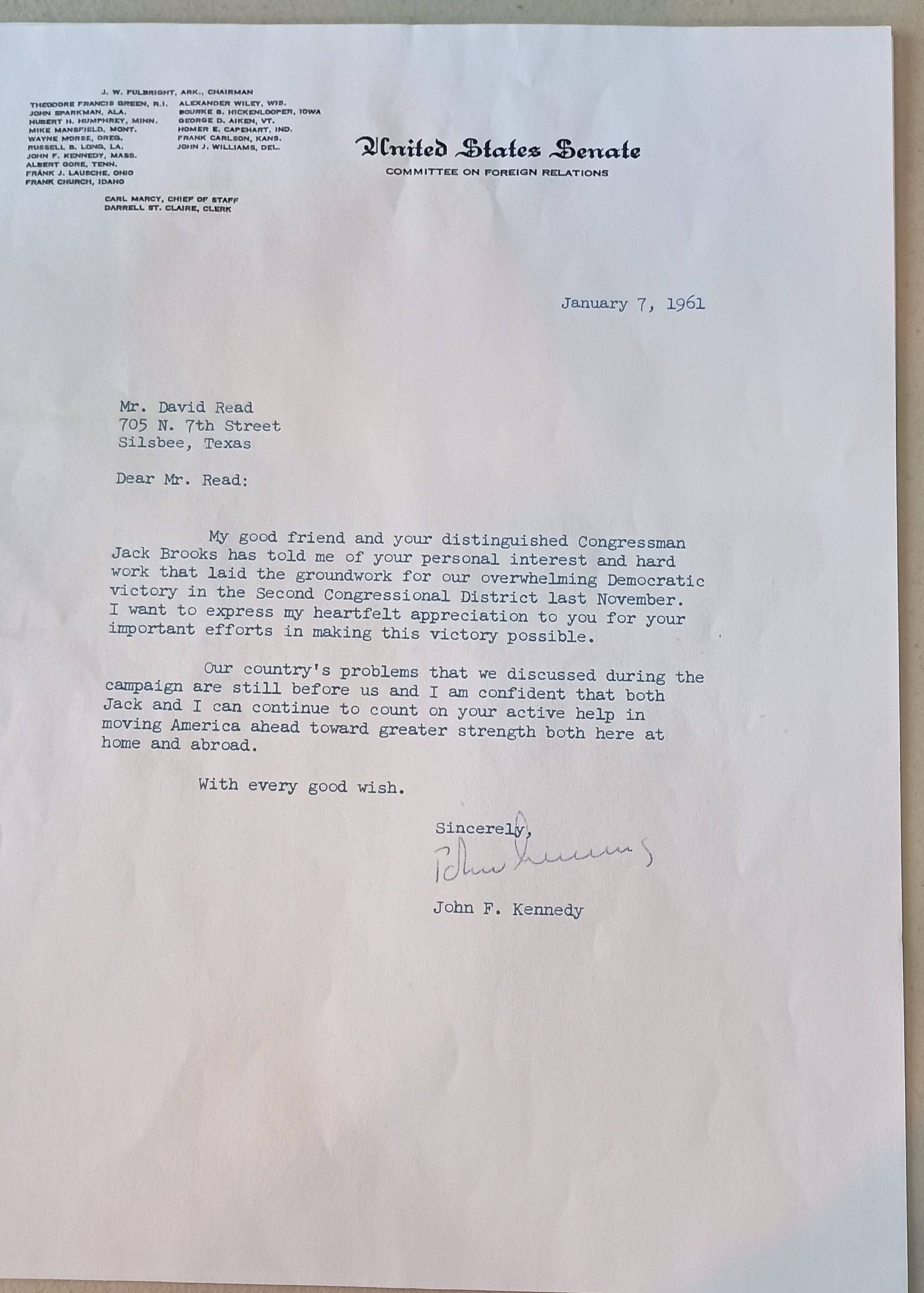 Copy of a letter to David Read from John F. Kennedy dated January 7, 1961 - location of original letter and envelope unknownCollection