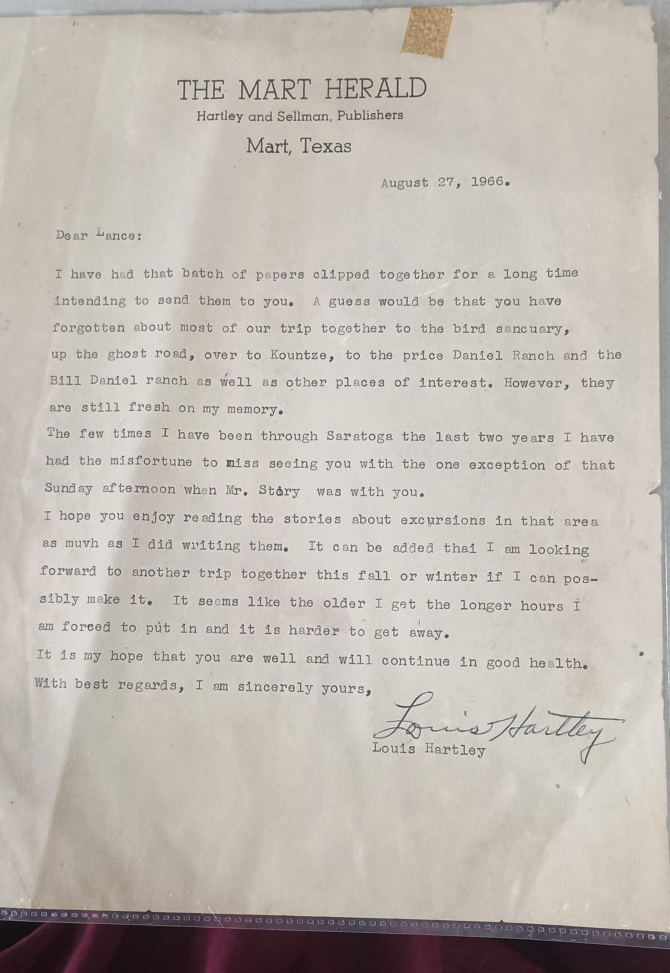 Letter to "Lance" dated August 27, 1966 from Louis Hartley regarding Saratoga