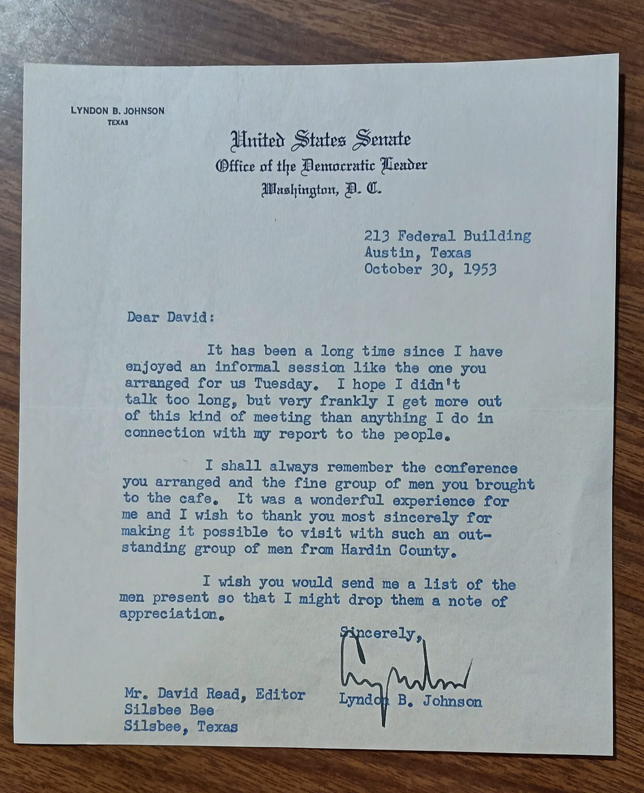 Letter to David Read from Lyndon B Johnson dated October 30, 1953 discussing meeting held at cafeCollection