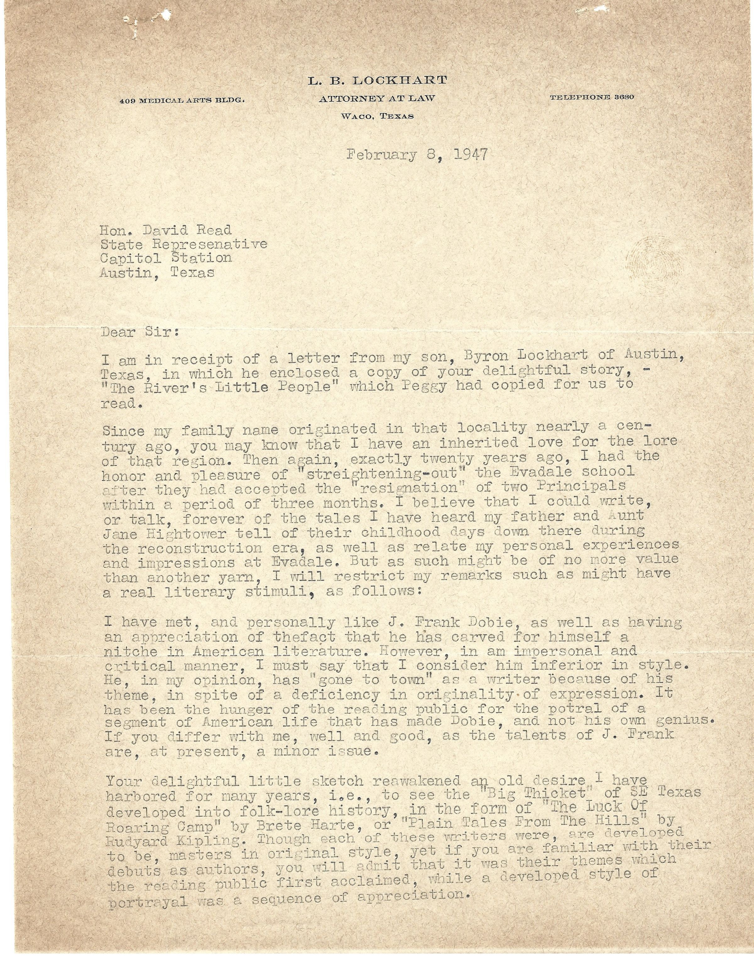 David Read, L B Lockhart, Texas House of Representatives, "The River's Little People", News Article, Peggy LockhartCreated By