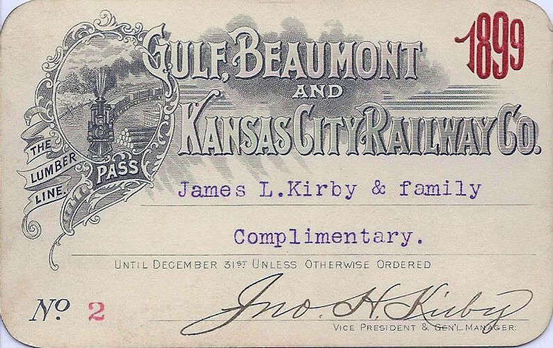 Gulf, Beaumont and Kansas City Railway Pass for James L Kirby & FamilyTags