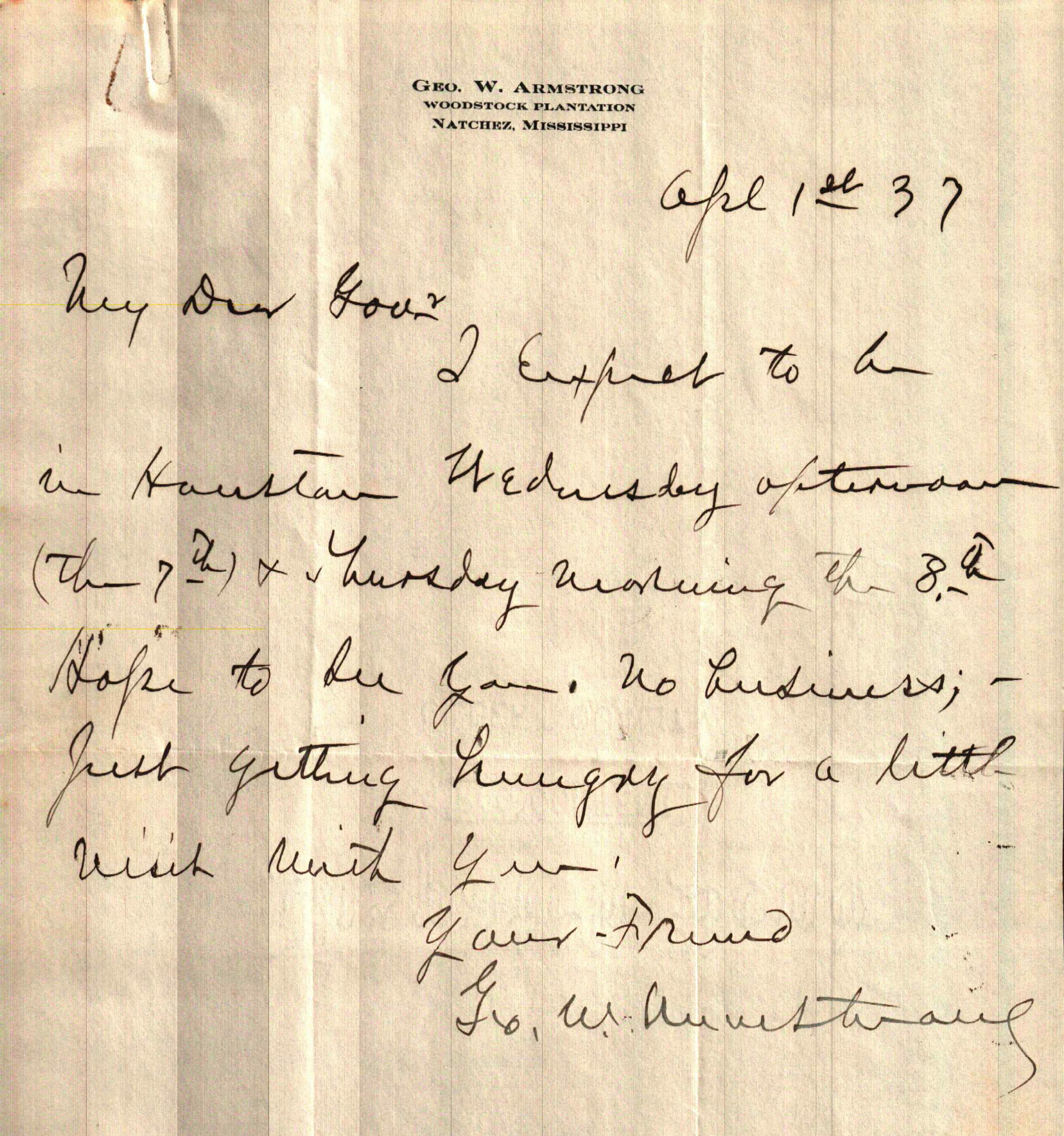 Handwritten Letter from George W Armstrong to John H Kirby dated April 1, 1937Tags
