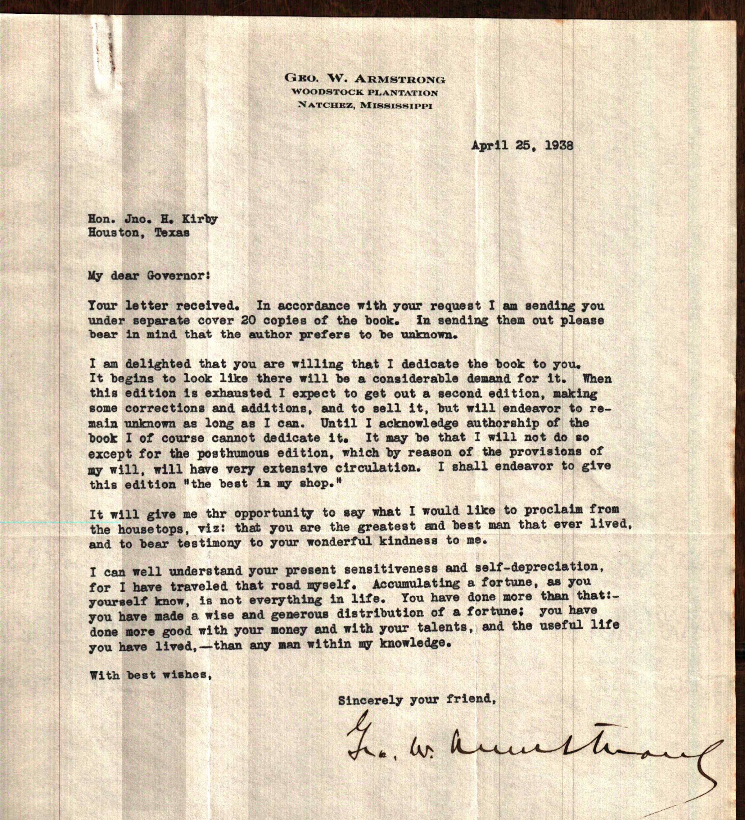 Letter from George W Armstrong to John Henry Kirby dated April 25, 1938 concerning book copiesTags