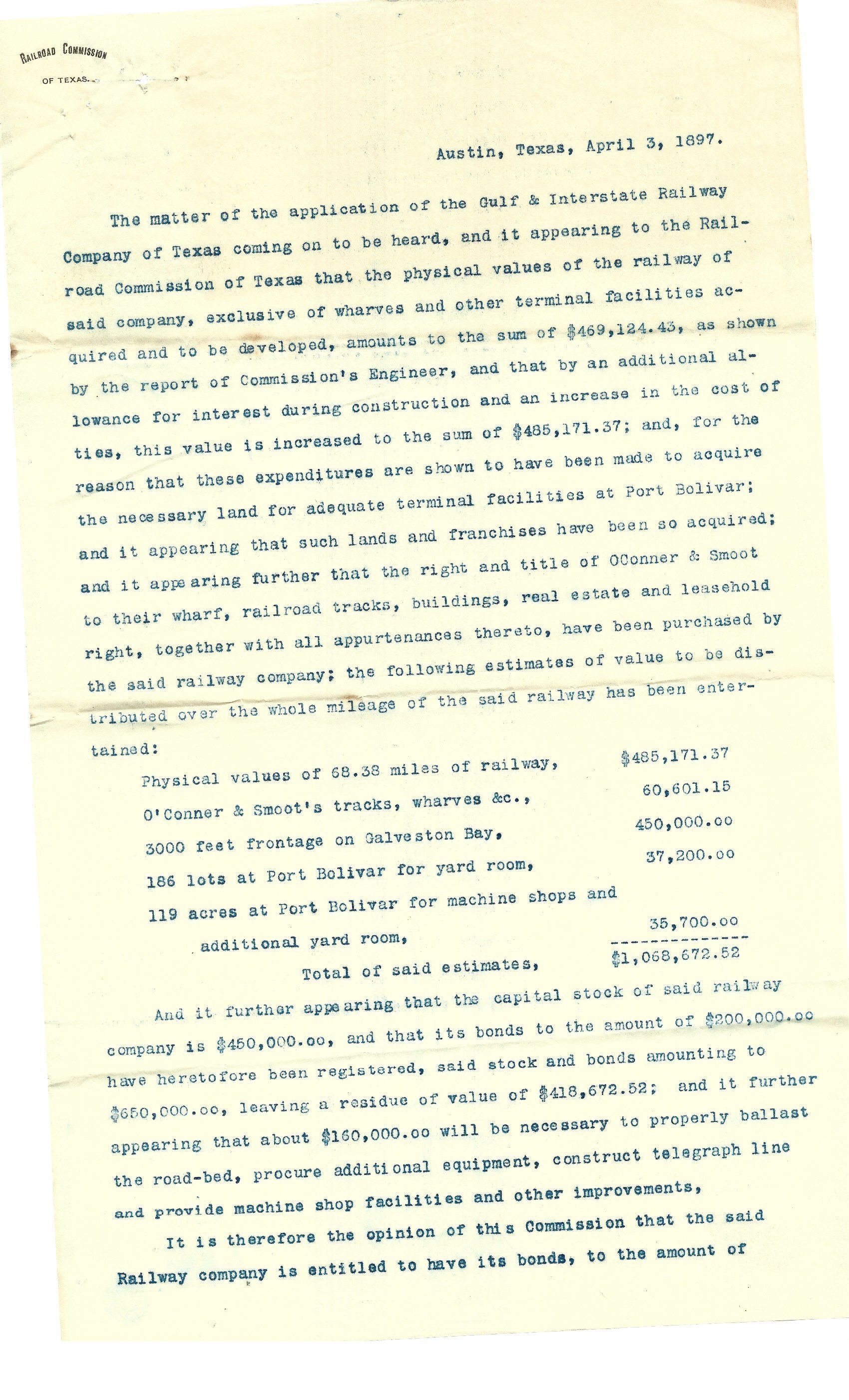 Railroad Commission Approval of Bond Sales for Gulf & Interstate Railway Company of Texas dated April 3, 1897Tags