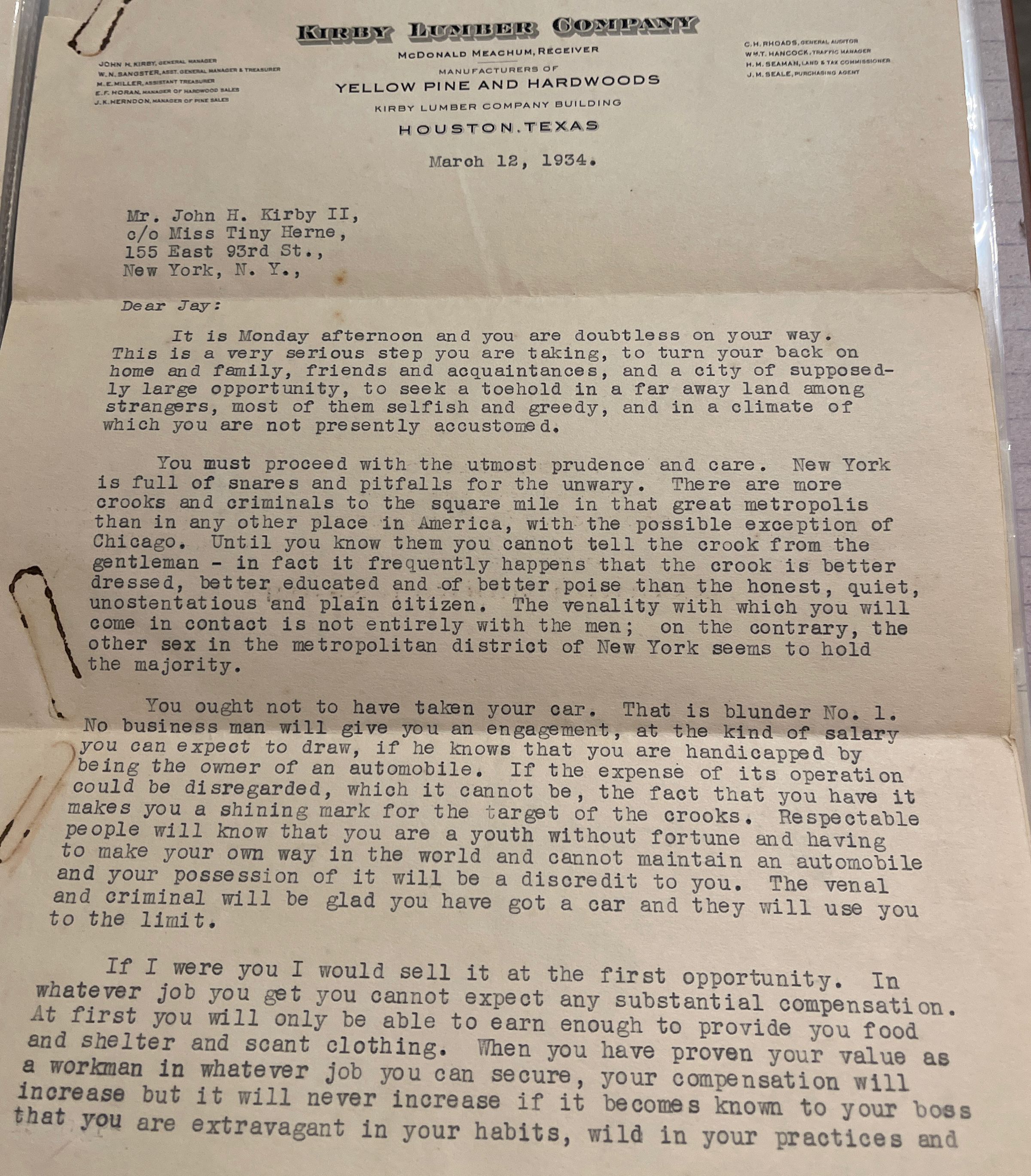 Letter to John H Kirby II (Jay) from John Henry Kirby dated March 12, 1934Tags