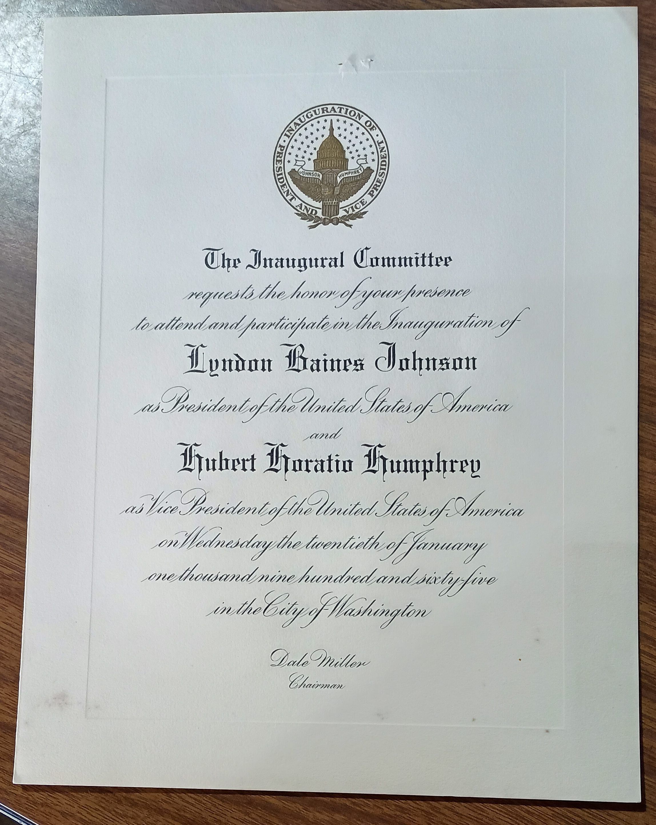 Invitation sent to David Read for the Inauguration of Lyndon Baines Johnson as President of the United States and Hubert Horatio Humphrey as Vice President January 20, 1965Collection