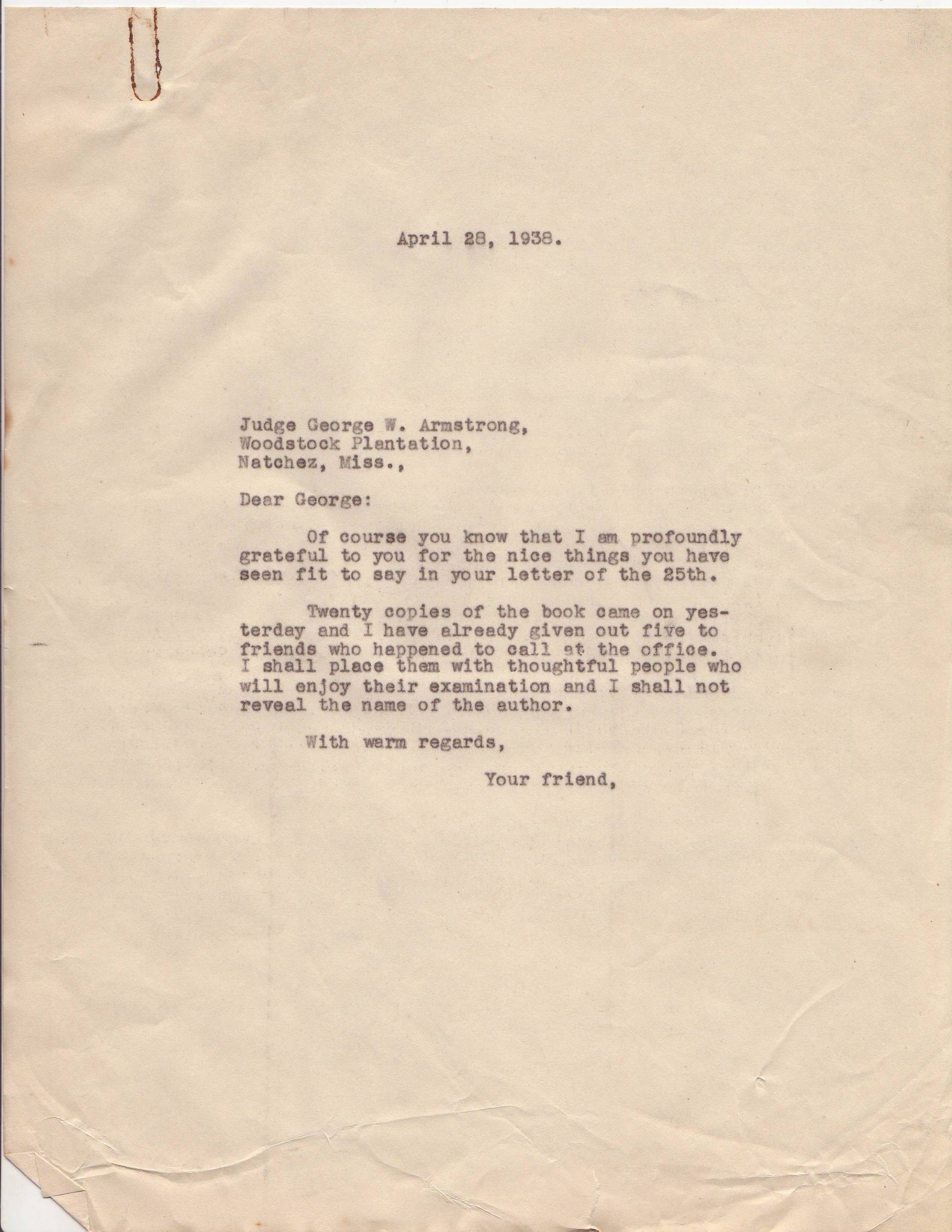Letter to George W Armstrong from John H Kirby dated April 28,1938