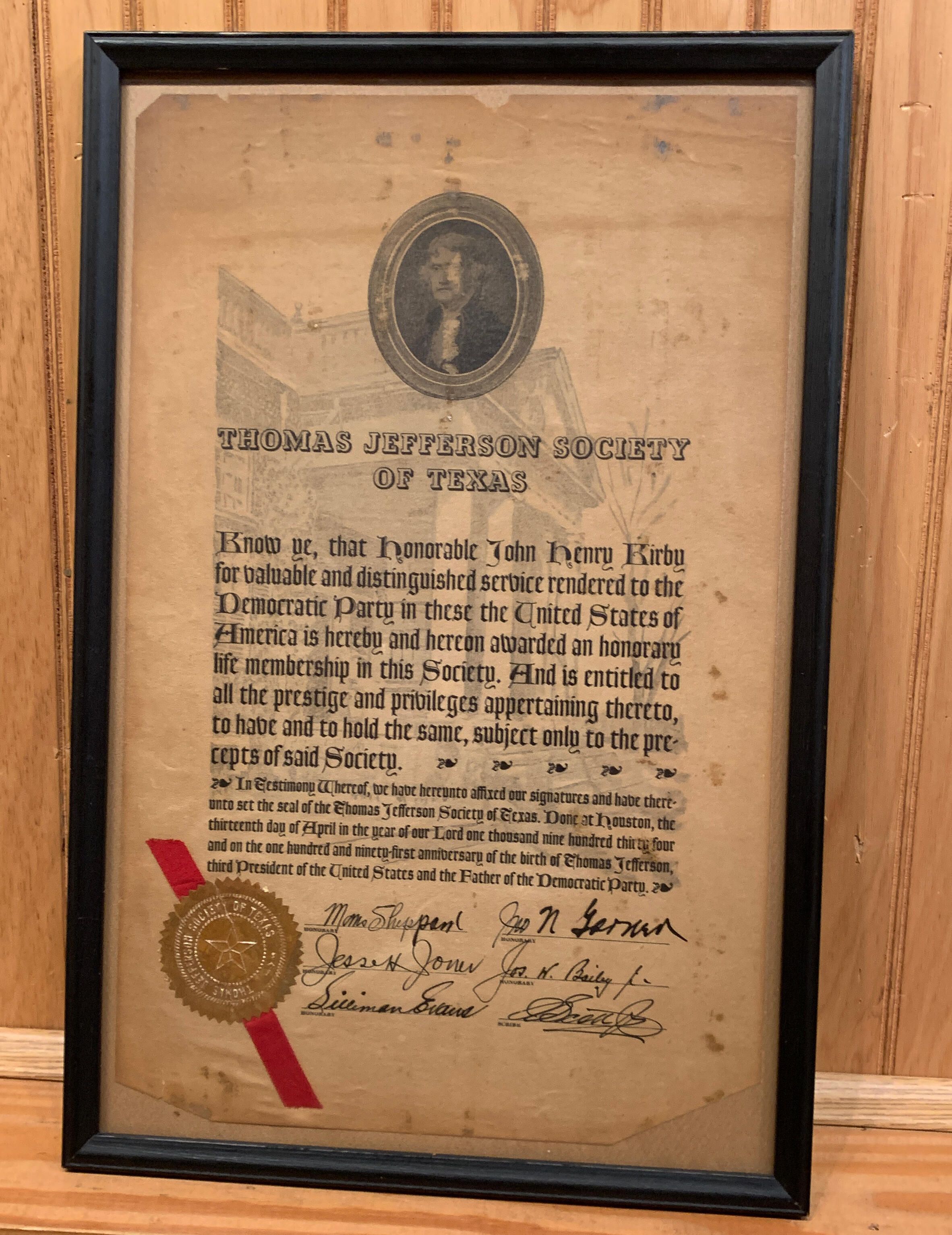 John Henry Kirby, Thomas Jefferson Society, FramedSecondary Title