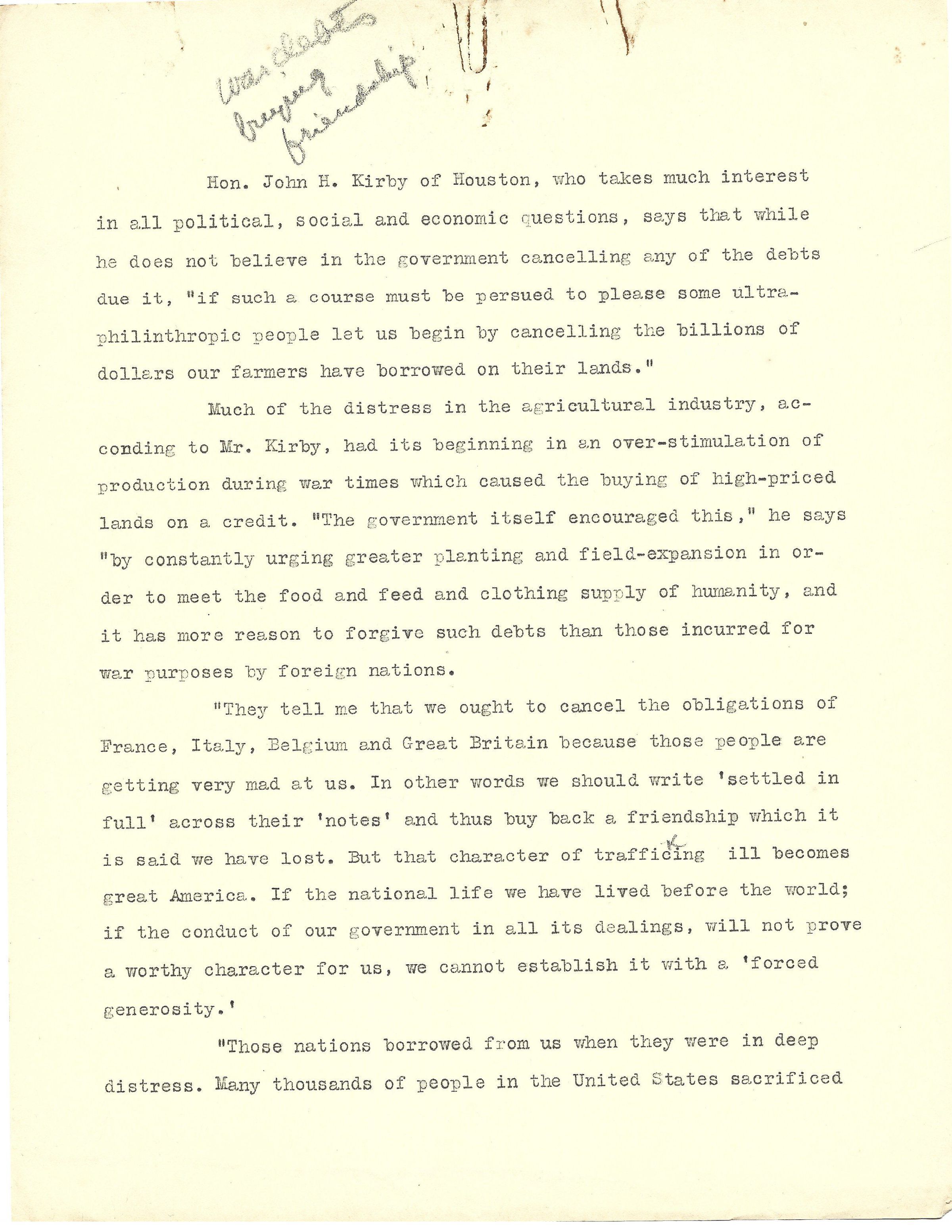 Article about Various Speeches given by John Henry Kirby related to War Debts and Buying FriendshipTags