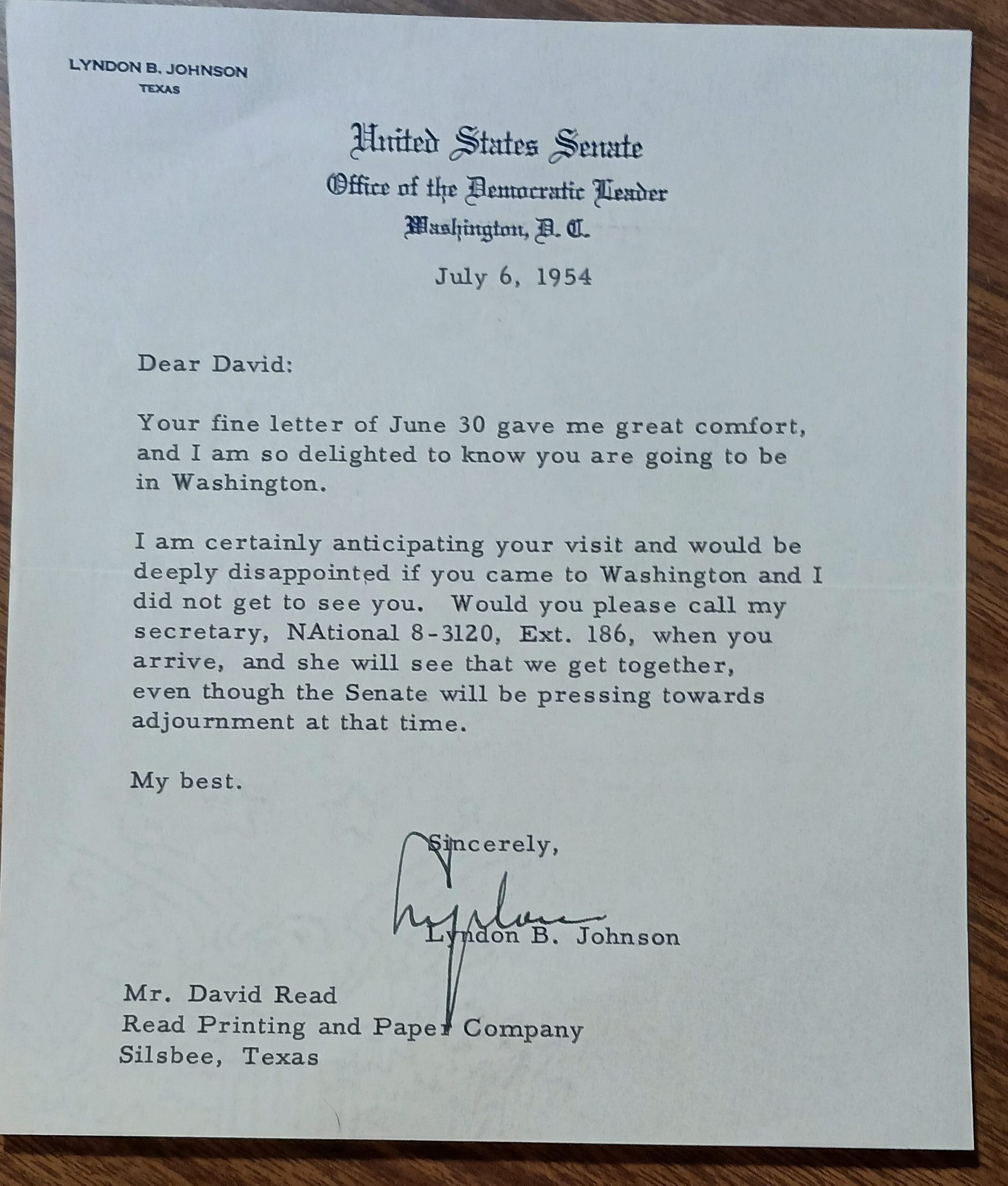 Letter to David Read from Lyndon B Johnson dated July 6, 1954Tags