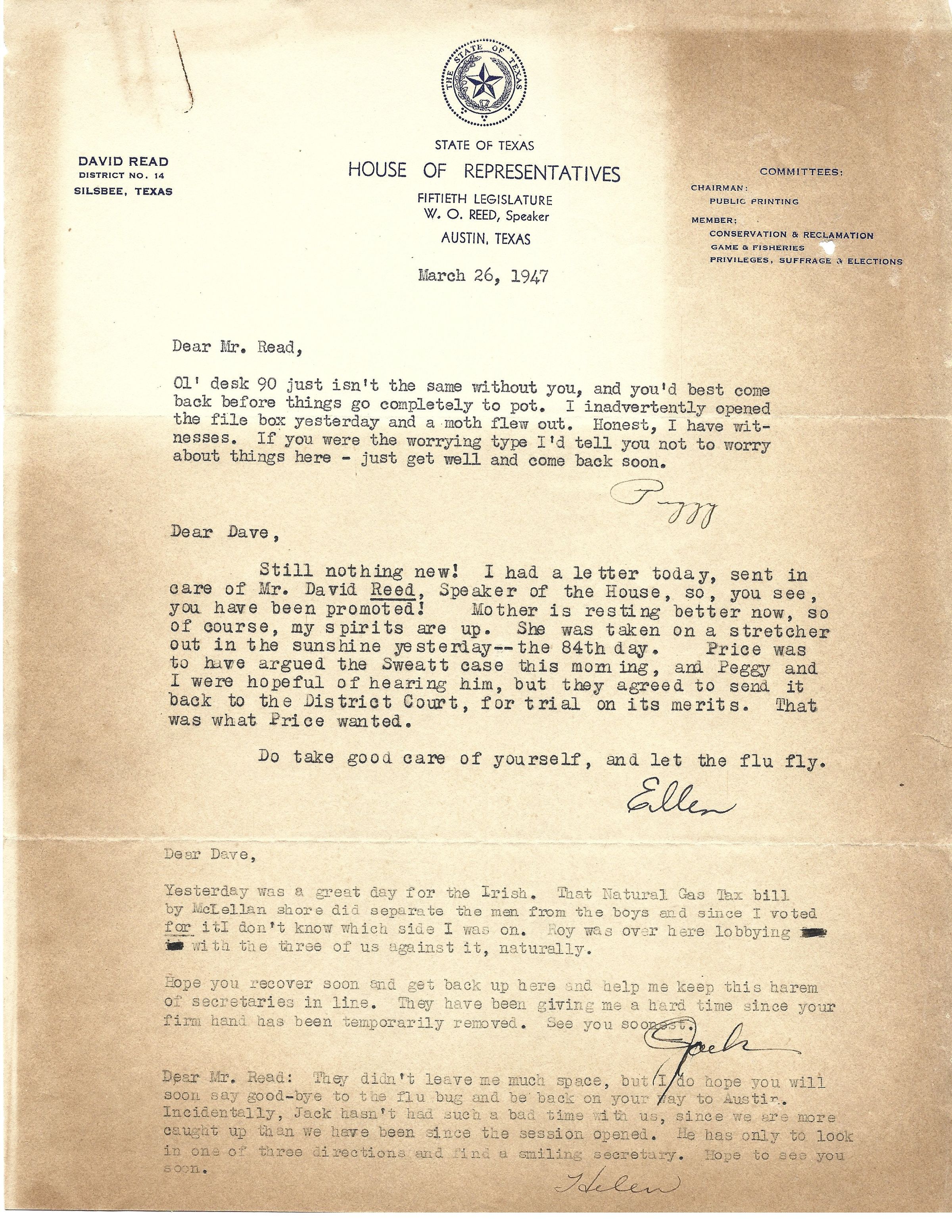 Letter to David Read from Peggy, Ellen, Jack Brooks, and Helen March 26, 1947Tags