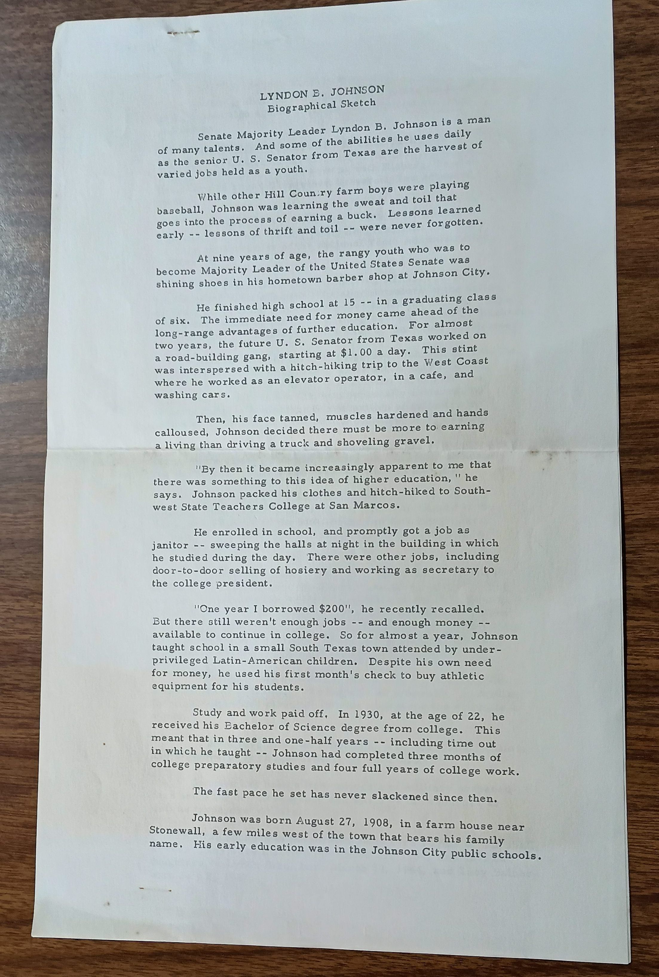 Lyndon B Johnson Biographical Sketch - was part of David Read's papersCollection
