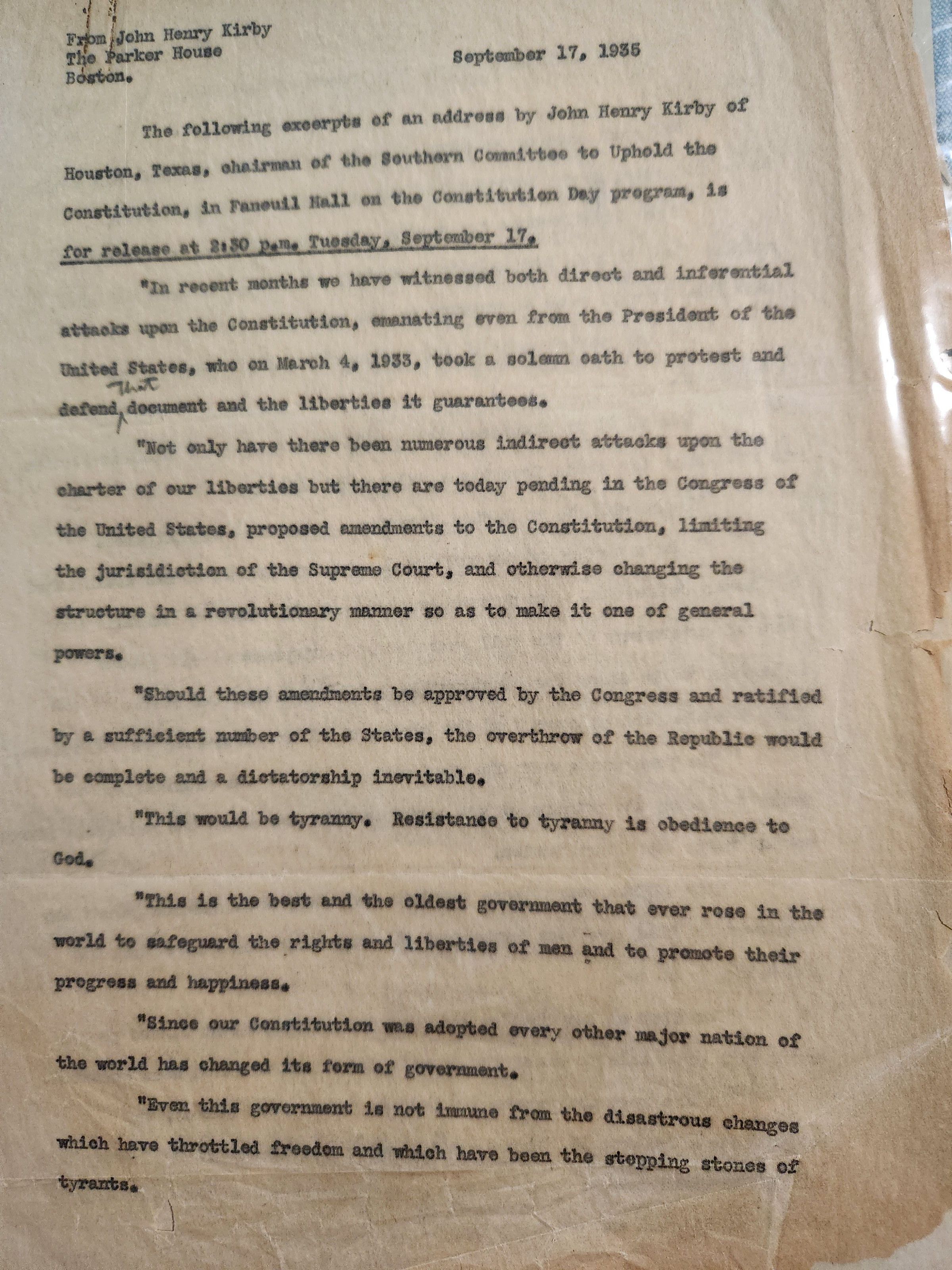 Excerpts of address by John H Kirby on September 17, 1936 in Faneuill Hall in Constitution Day ProgramTags