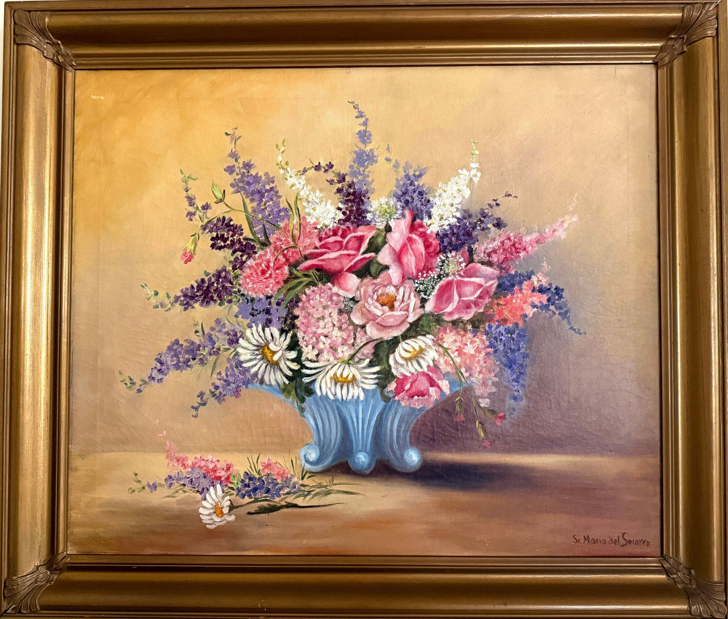Sister María del Socorro was perhaps the most prolific visual artist in CCVI history. An artist from a young age, she received an abundance of formal training throughout her life. Sister María del Socorro first studied at Incarnate Word College (IWC) under Sister Alphonsine Seiwert (1884 – 1956), to whom she attributed much of her artistic knowledge. She traveled to Chicago with Sister Alphonsine to study at the Art Institute of Chicago twice: once during the summer of 1926, and again for the academic year of 1930 – 1931. She traveled far and wide in pursuit of artistic training and studied under the tutelage of several esteemed artists, including Frank Reaugh (1860 – 1945) in Dallas, Texas, Jacob Getlar Smith (1898 – 1958) in Saltillo, Mexico, and Frederic Taubes (1900 – 1981) in Taos, New Mexico.
