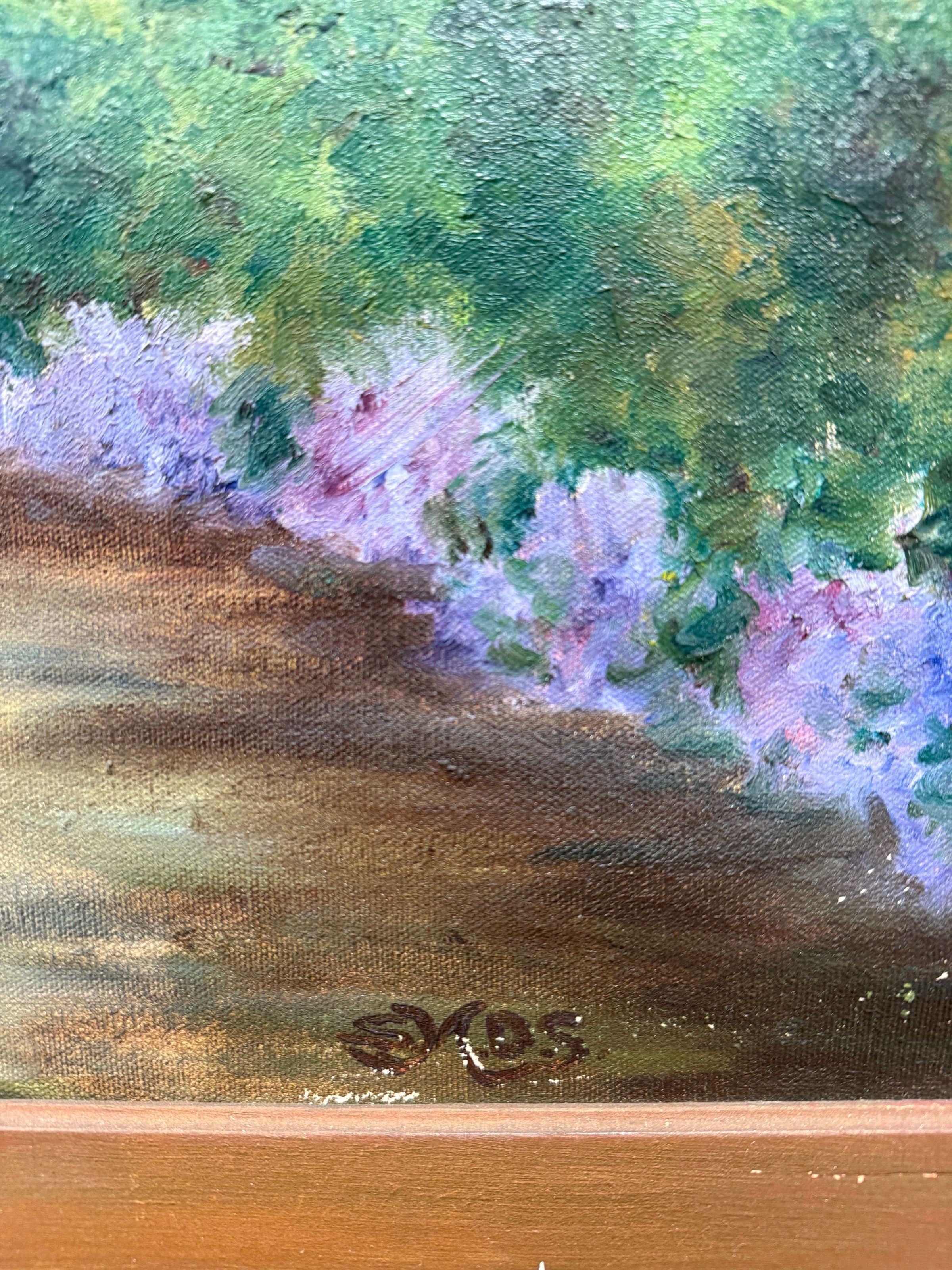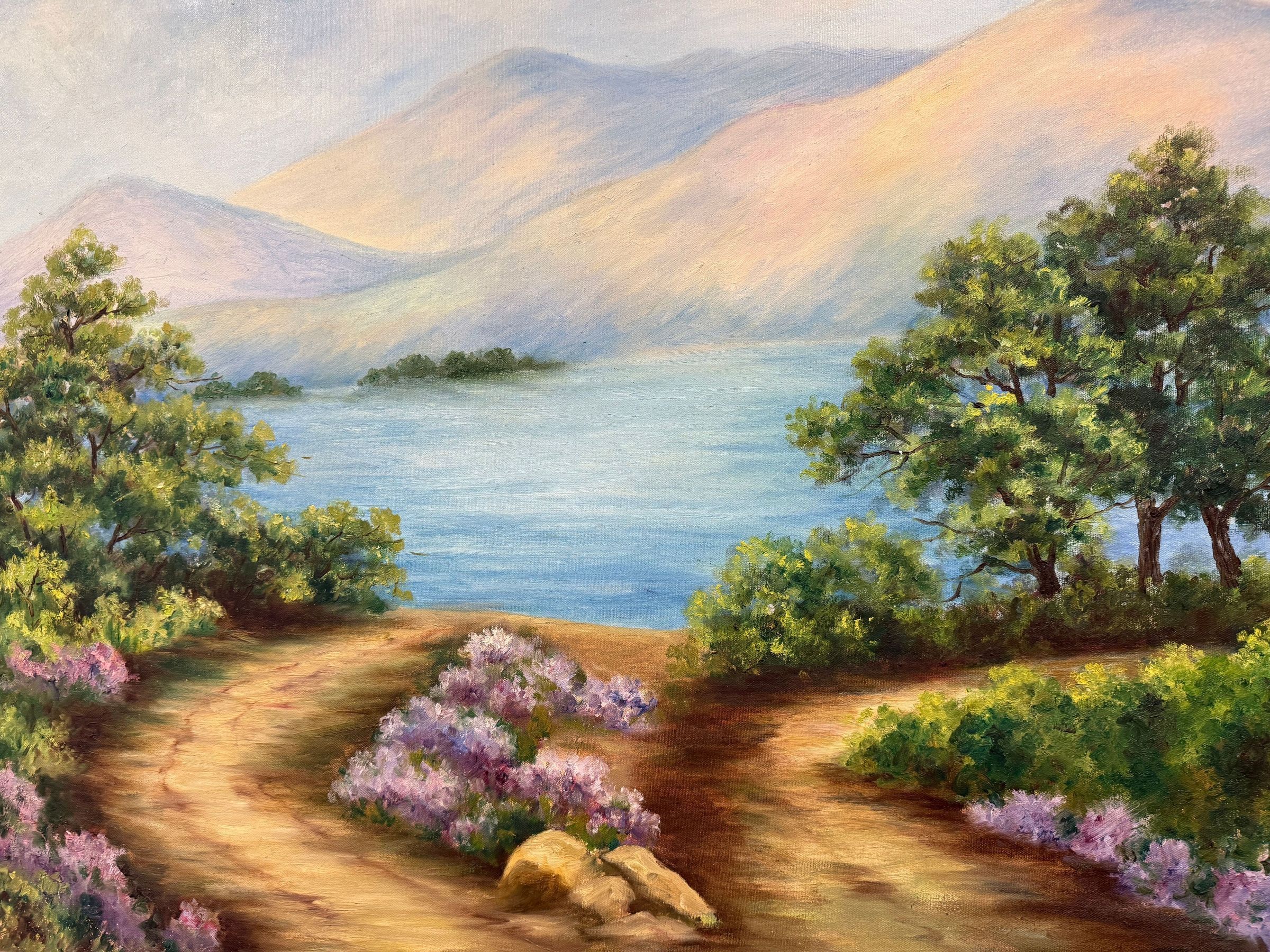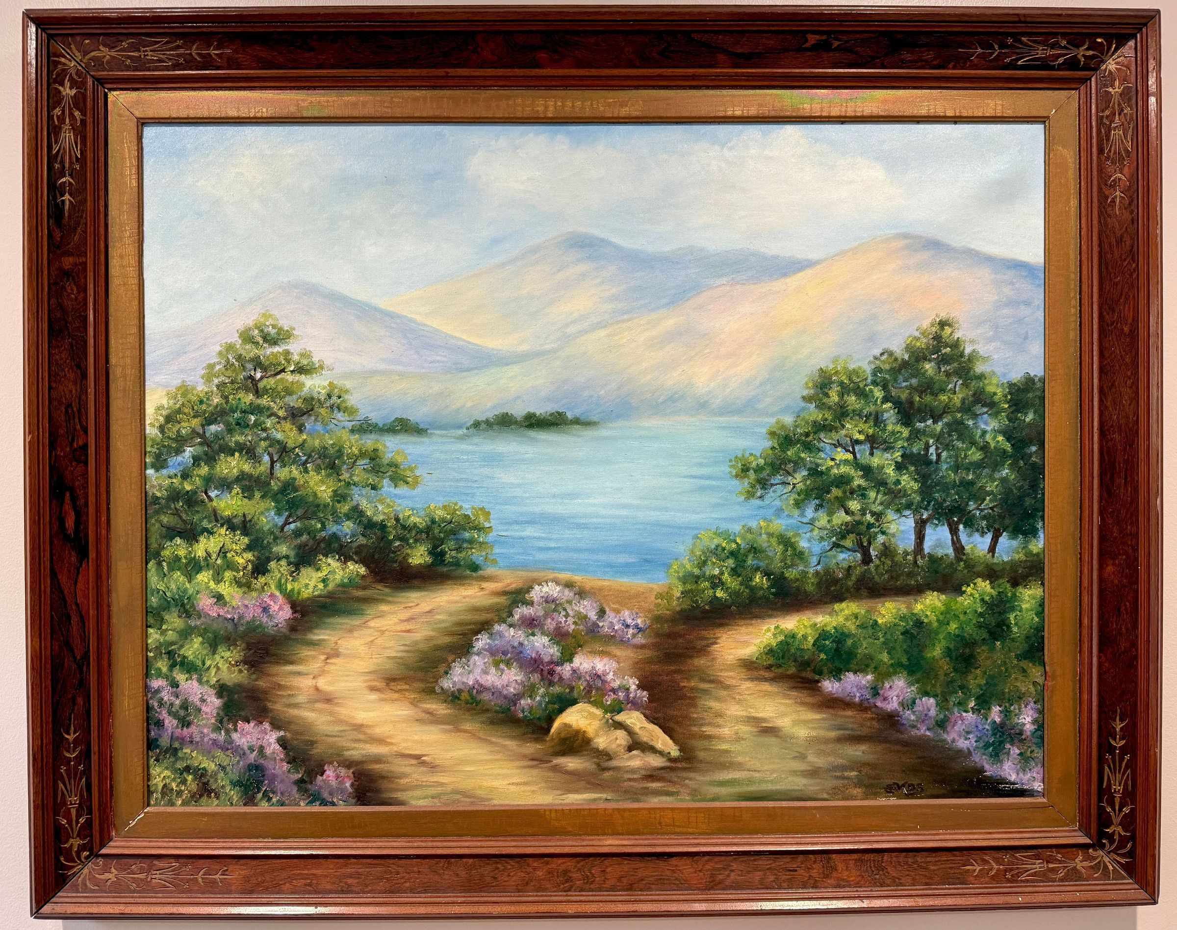 Title [assigned by archives]: Landscape with Mountains and Lake Sister María del Socorro Lazo Houston (1893 – 1956) painted an idyllic landscape with rolling mountains cascading above a placid lake. In the foreground, a dirt road forks towards the coast, sprinkled with purple flowers and lush green foliage. While Sister María del Socorro spent most of her life in San Antonio, she painted numerous landscapes of Texas and Mexico. Título [asignado por los archivos]: Paisaje con montañas y lago Sor María del Socorro Lazo Houston (1893-1956) pintó un paisaje idílico con montañas onduladas que caen en cascada sobre un lago tranquilo. En primer plano, un camino de tierra se bifurca hacia la costa, salpicado de flores moradas y exuberante follaje verde. Aunque Sor María del Socorro pasó la mayor parte de su vida en San Antonio, pintó numerosos paisajes de Texas y México.