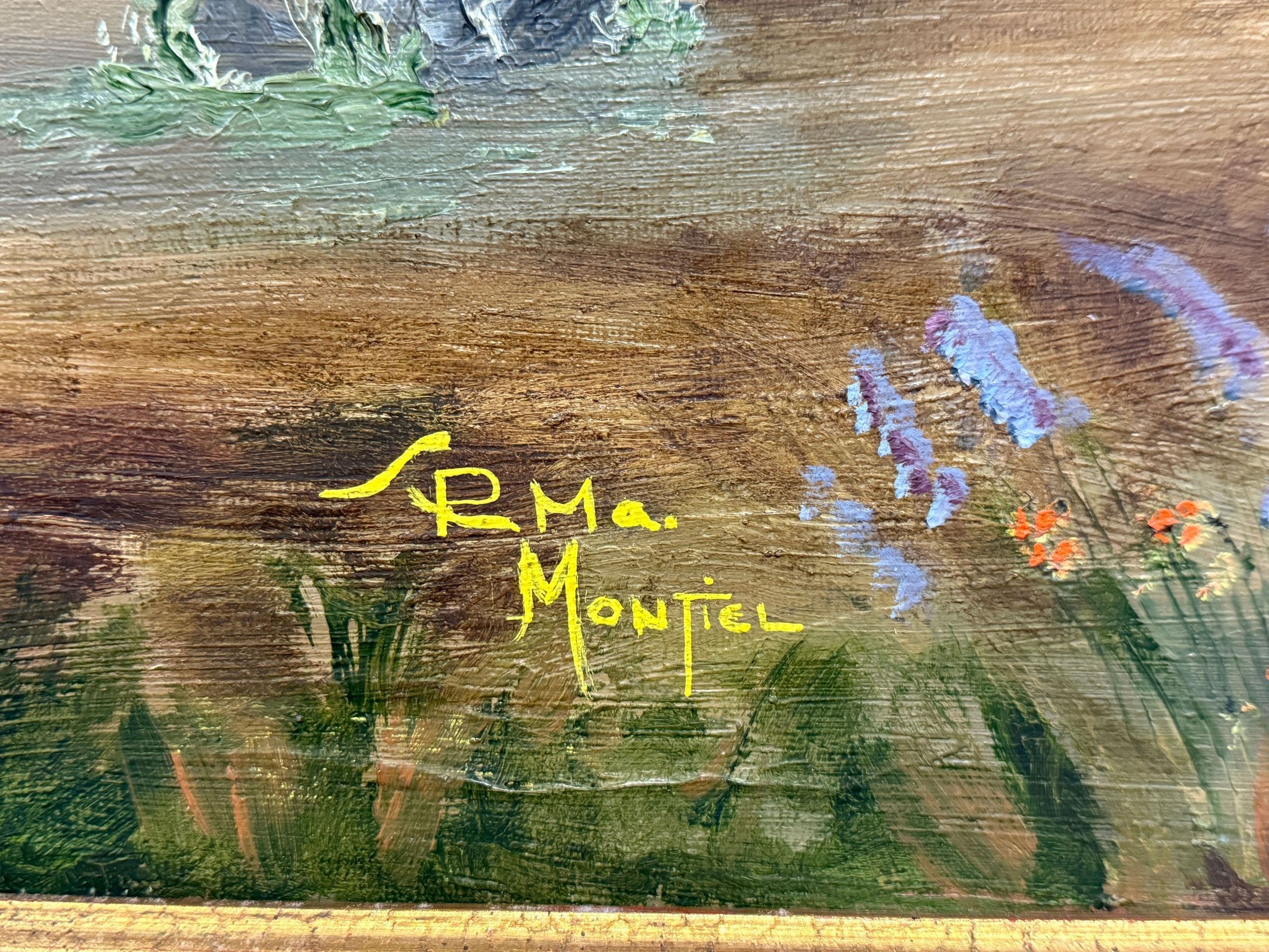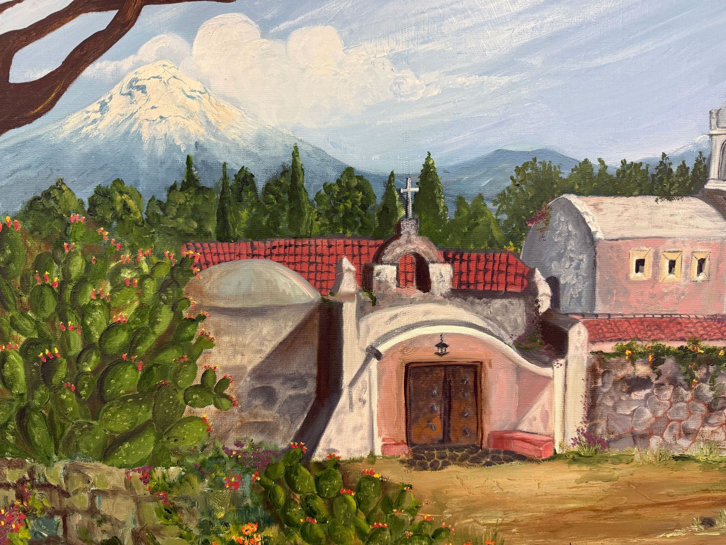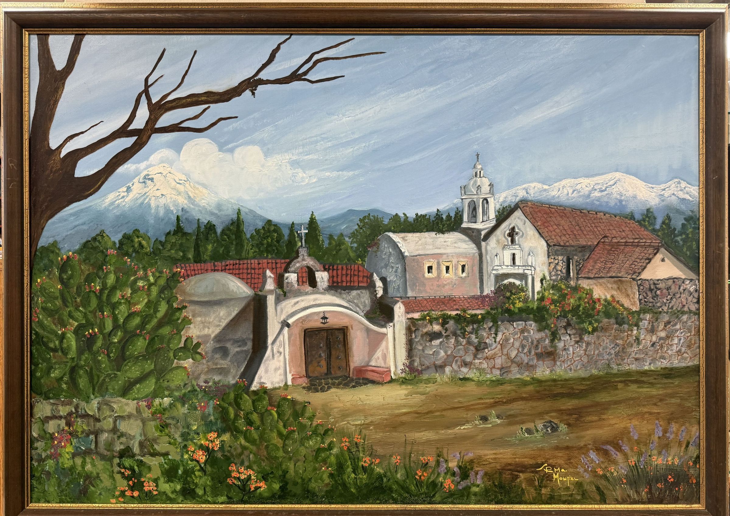 Title [assigned by archives]: Church with Mountains In this large oil painting, Sor Rosa María Montiel y Castellanos, CCVI (1931 - 2025) depicted an adobe church complex with a red tile roof. The church is surrounded by a stone wall with a two-door entryway leading into the church courtyard. Bright green cactus and orange and purple wildflowers add color to the foreground. Snowcapped mountains emerge in the distance behind the church, their peaks touching the clouds. According to Sor Rosa María, she made approximately 60 paintings throughout her life, but gave most of them away as gifts. Título [asignado por los archivos]: Iglesia con montañas En este gran óleo, Sor Rosa María Montiel y Castellanos, CCVI (1931 - 2025) representa un complejo de iglesias de adobe con tejado de tejas rojas. La iglesia está rodeada por un muro de piedra con una entrada de dos puertas que conduce al patio de la iglesia. Cactus de un verde intenso y flores silvestres naranjas y moradas dan color al primer plano. Detrás de la iglesia, a lo lejos, aparecen montañas nevadas cuyos picos tocan las nubes. Según Sor Rosa María, pintó unos 60 cuadros a lo largo de su vida, pero la mayoría los regaló.