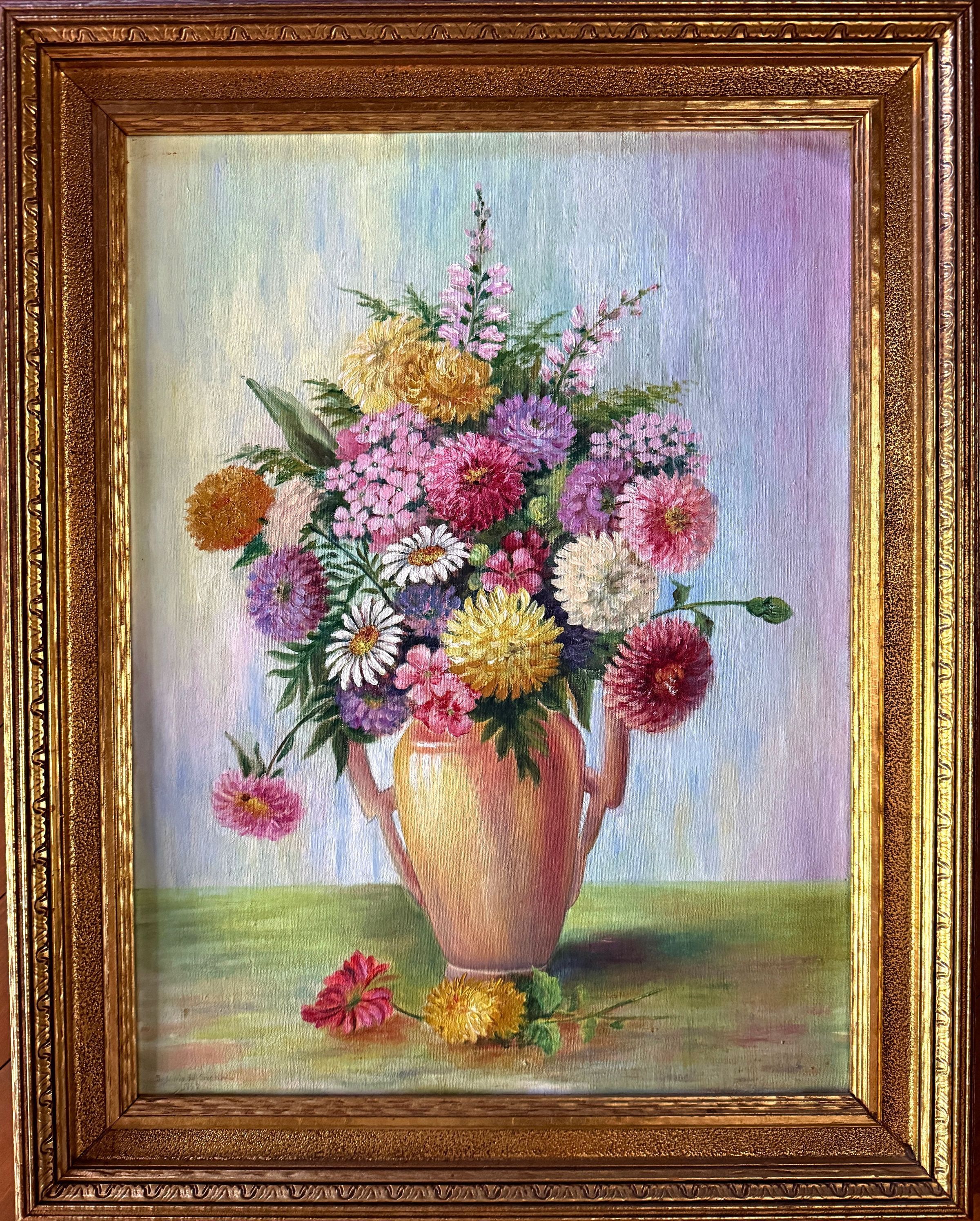 Title [assigned by archives]: Still Life with Dahlias and Daisies Sister María del Socorro Lazo Houston, CCVI (1893 – 1956) created numerous still life paintings during her life. This painting from 1932 depicts a vibrant bouquet of pink, yellow, and purple dahlias with white daisies and snapdragons in a clay vase. Two fallen flowers sit at the foot of the vase. The background of this painting has an ombre effect and transitions from yellow to blue to pink. Sister María del Socorro painted this work during her 1931-1938 tenure as an art teacher at St. Mary's Academy in Amarillo, Texas. Título [asignado por los archivos]: Naturaleza muerta con dalias y margaritas La sor María del Socorro Lazo Houston, CCVI (1893-1956) creó numerosas pinturas de naturalezas muertas a lo largo de su vida. Esta pintura de 1932 representa un vibrante ramo de dalias rosas, amarillas y moradas con margaritas blancas y bocas de dragón en un jarrón de arcilla. Dos flores caídas yacen al pie del jarrón. El fondo de esta pintura tiene un efecto degradado y pasa del amarillo al azul y al rosa.