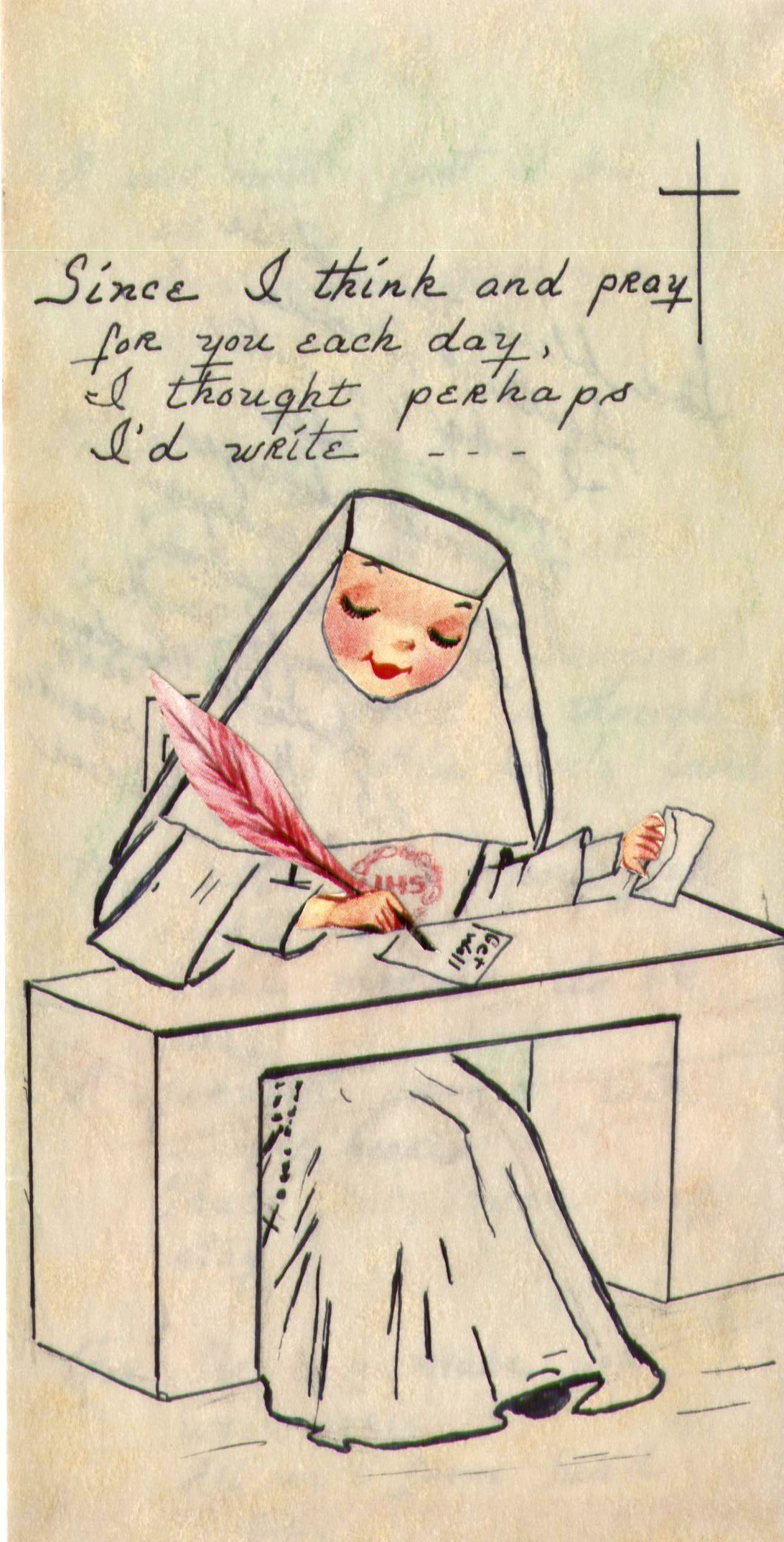 On the front of the card, Sister Joan drew around pasted drawings of a woman’s face hands. She depicted a nun wearing the traditional CCVI habit, writing a “Get well” letter with a feather quill. Above the drawing, Sister Joan wrote, “Since I think and pray for you each day, I thought perhaps I’d write…”