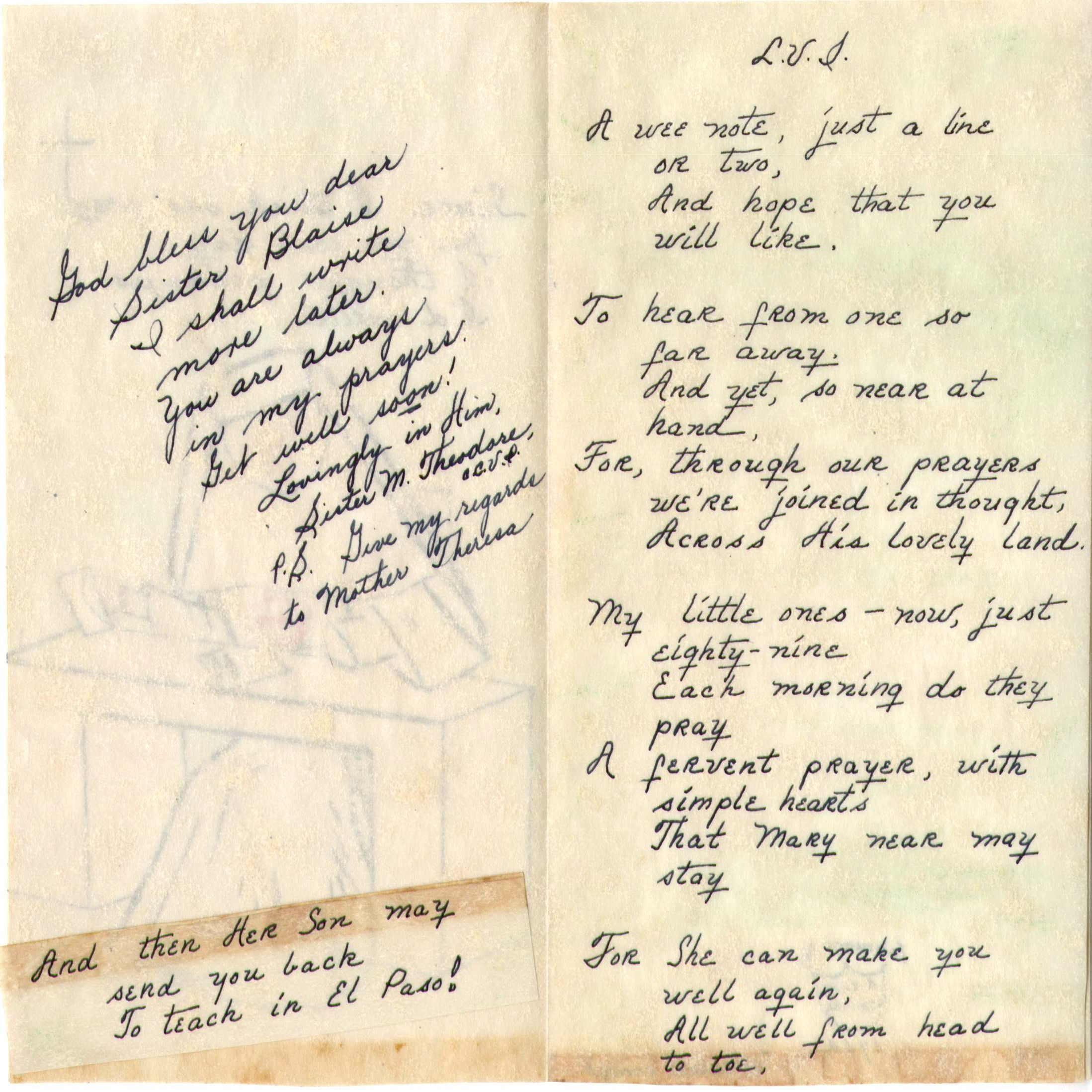 Una nota en el lado izquierdo del interior de la tarjeta dice: «Que Dios te bendiga, querida hermana Blaise. Te escribiré más adelante. Siempre estás en mis oraciones. ¡Que te mejores pronto! Con amor en Él, hermana M. Theodore, C.C.V.I. P.D.: Dale recuerdos a la madre Teresa».