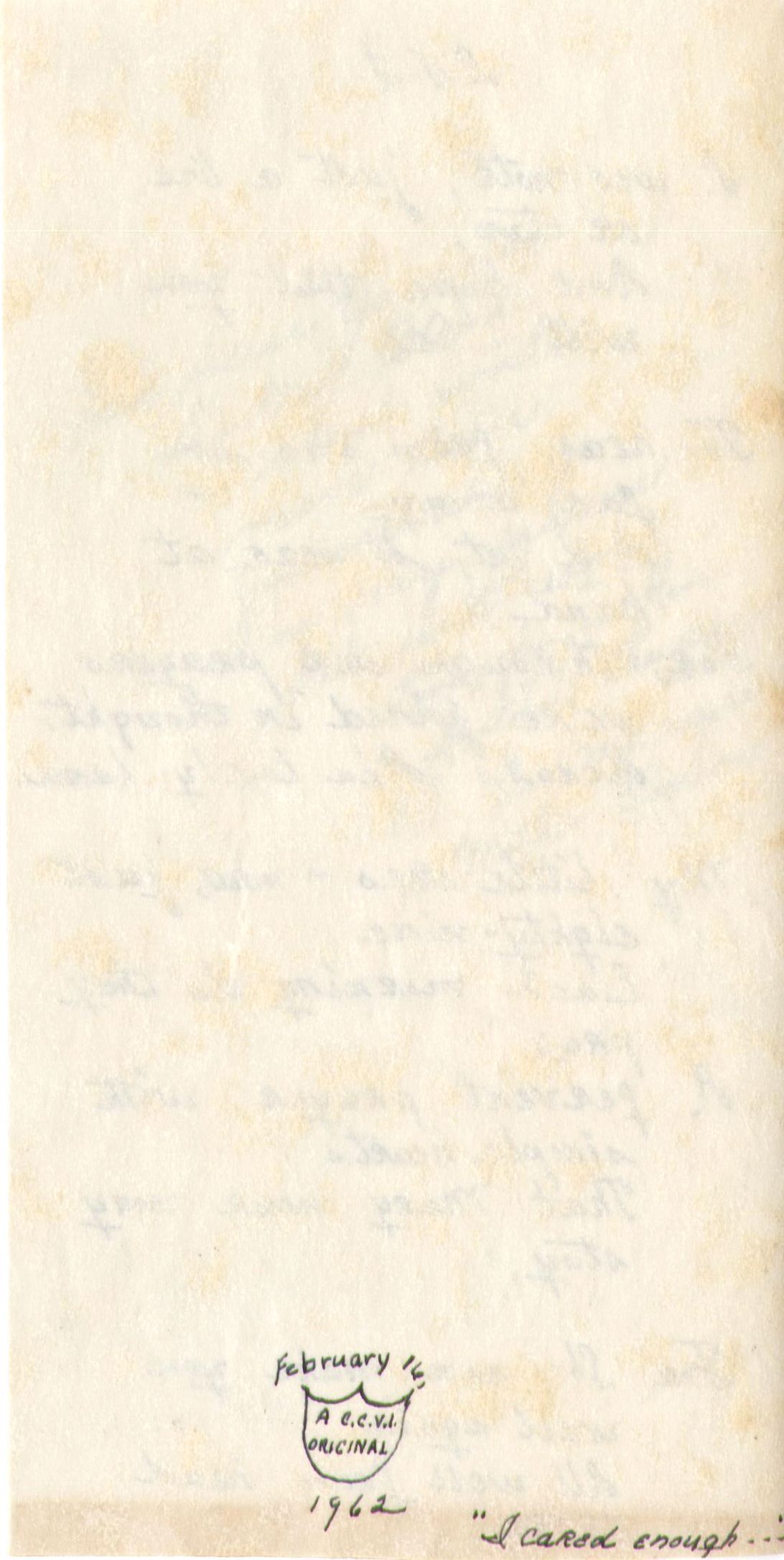 On the back of the card, Sister Joan created a brand logo. Inside of a small crest, she wrote, “A C.C.V.I. ORIGINAL”. The date, February 16, 1962, encircles the logo. To the side, Sister Joan wrote, “I cared enough…”