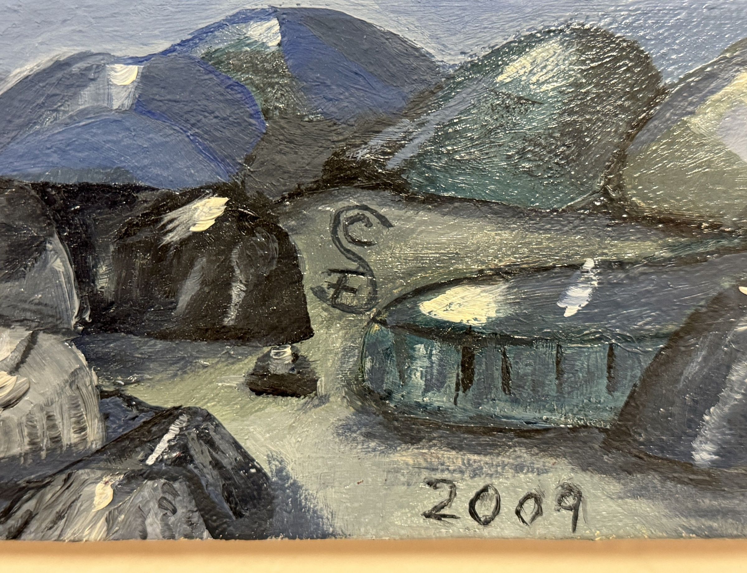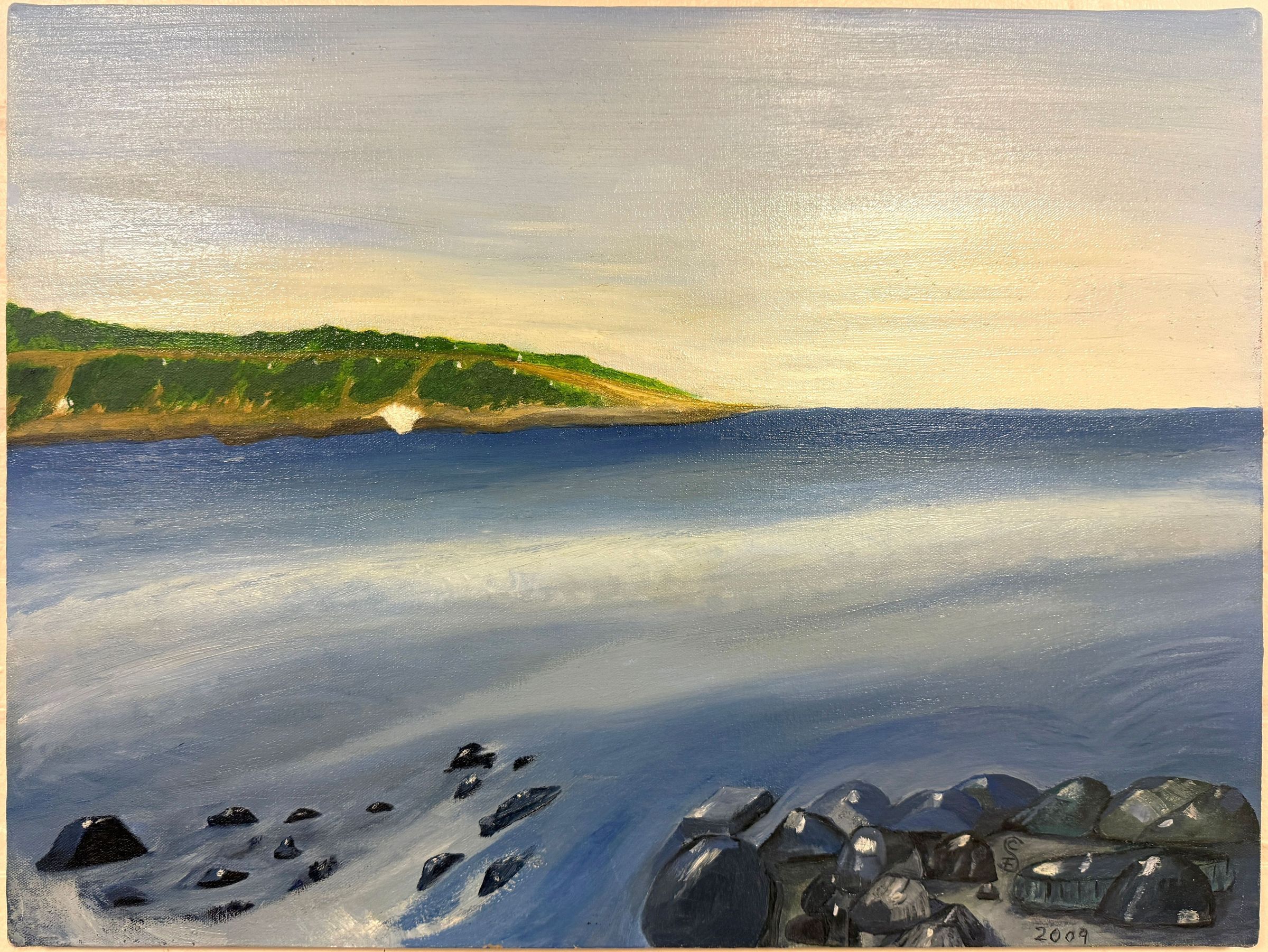 Title [assigned by archives]: Landscape with Ocean Sister Catalina Fresquez, CCVI (1937 – 2019) painted this landscape in 2009 while serving as treasurer for the CCVI Sisters. She depicted an ocean landscape with small waves lapping against black rocks in the foreground. A green strip of land juts into the ocean in the background. The deep blue ocean, swirled with white waves, and light blue sky occupy most of the canvas. Título [asignado por los archivos]: Paisaje con Océano La Hermana Catalina Fresquez, CCVI (1937 - 2019) pintó este paisaje en 2009 mientras servía como tesorera de las Hermanas CCVI. Representó un paisaje oceánico con pequeñas olas rompiendo contra rocas negras en primer plano. Una franja verde de tierra se adentra en el océano en el fondo. El océano azul intenso, con olas blancas, y el cielo azul claro ocupan la mayor parte del lienzo.